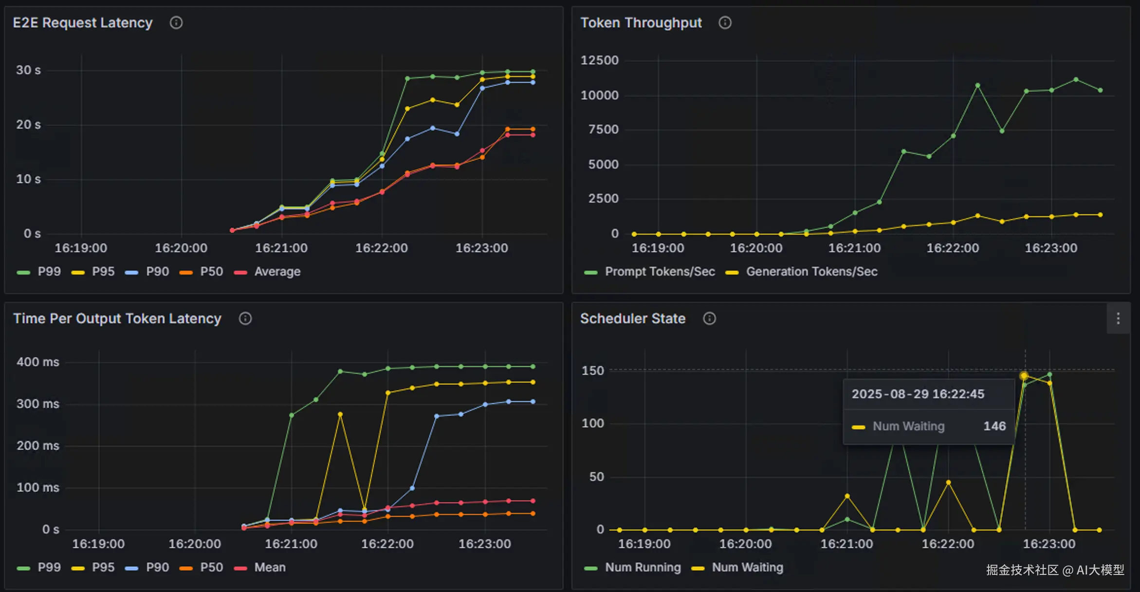 从监控中可以看到,从端到端的延迟以及token输出延迟指标来看,p50和平均值基本一致,而p90,p95和p99超出了许多,原因主要是由于在高并发后大量请求排队导致。这也符合高并发下的预期表现。