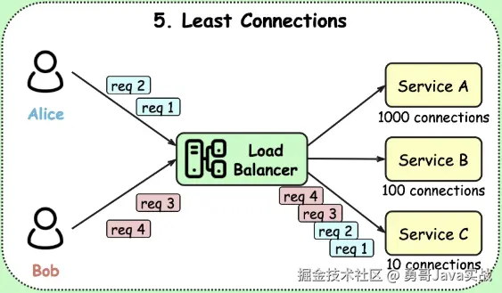 - 动态决策:新请求总是分配给当前连接数最少的服务器