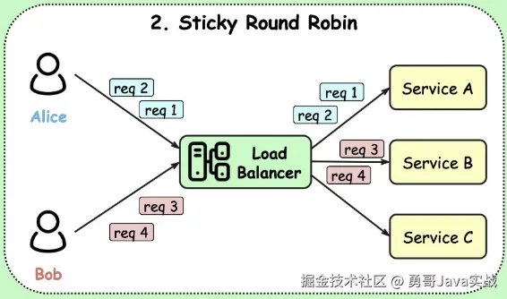 粘性轮询是标准轮询算法的一个变种,它通过记住客户端与服务实例的映射关系,确保来自同一客户端的连续请求会被路由到同一个服务实例上。
