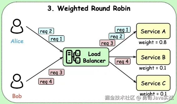 加权轮询是标准轮询算法的增强版本,它允许管理员为每个服务实例分配不同的权重值。权重越高的实例处理越多的请求,从而实现更精细的负载分配。