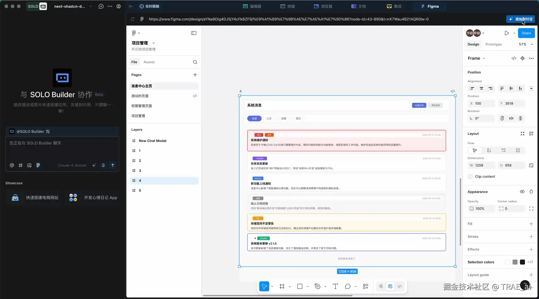 TRAE + Figma 将 AI 能力深度集成到产品设计的每个环节:从自然语言需求描述到可验证的交互原型。通过 TRAE 的语义理解与约束生成能力,我们将业务目标、用户场景与交互规则进行结构化处理,自动映射为 Figma 的页面架构、组件库与设计令牌,确保设计的一致性与可复用性。