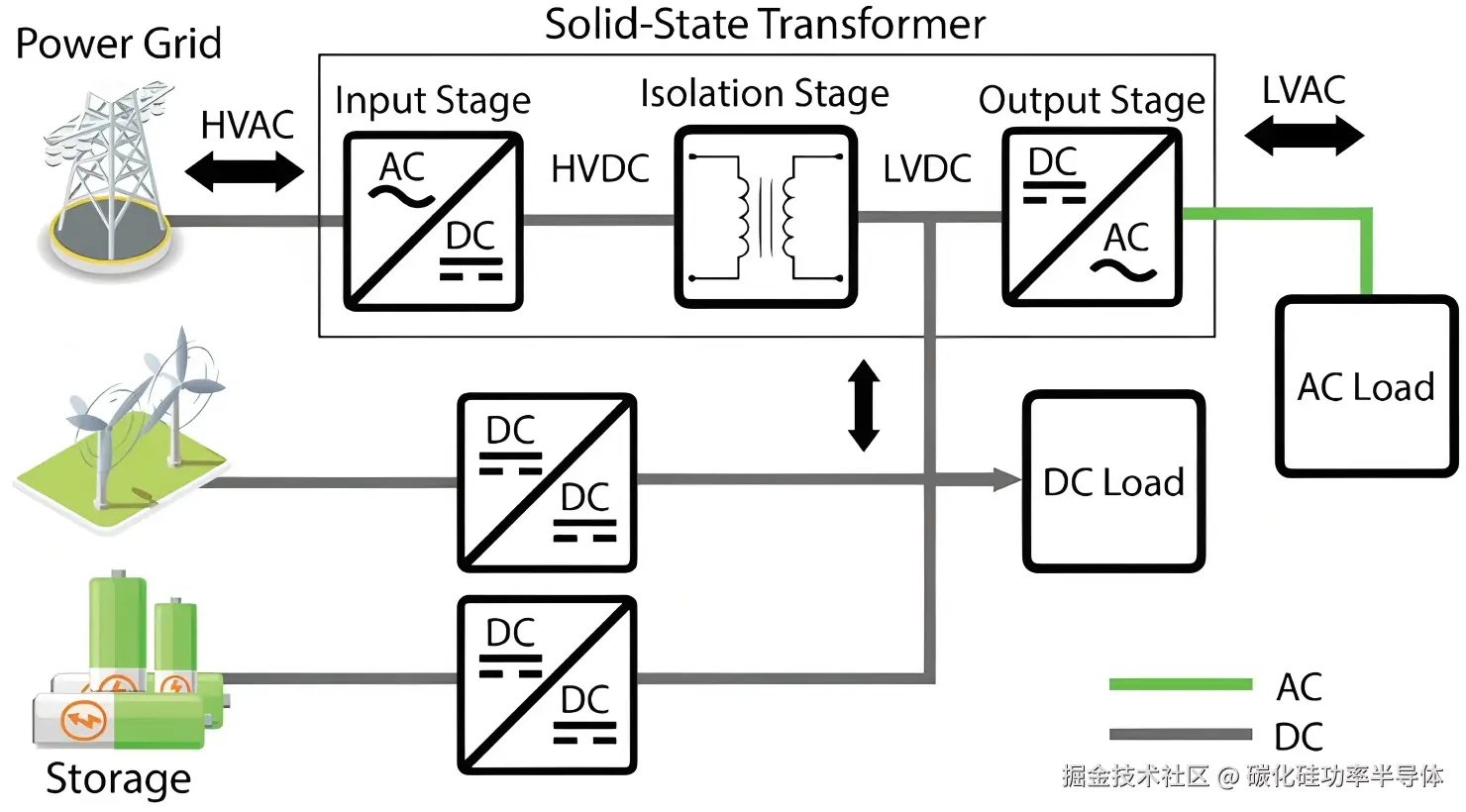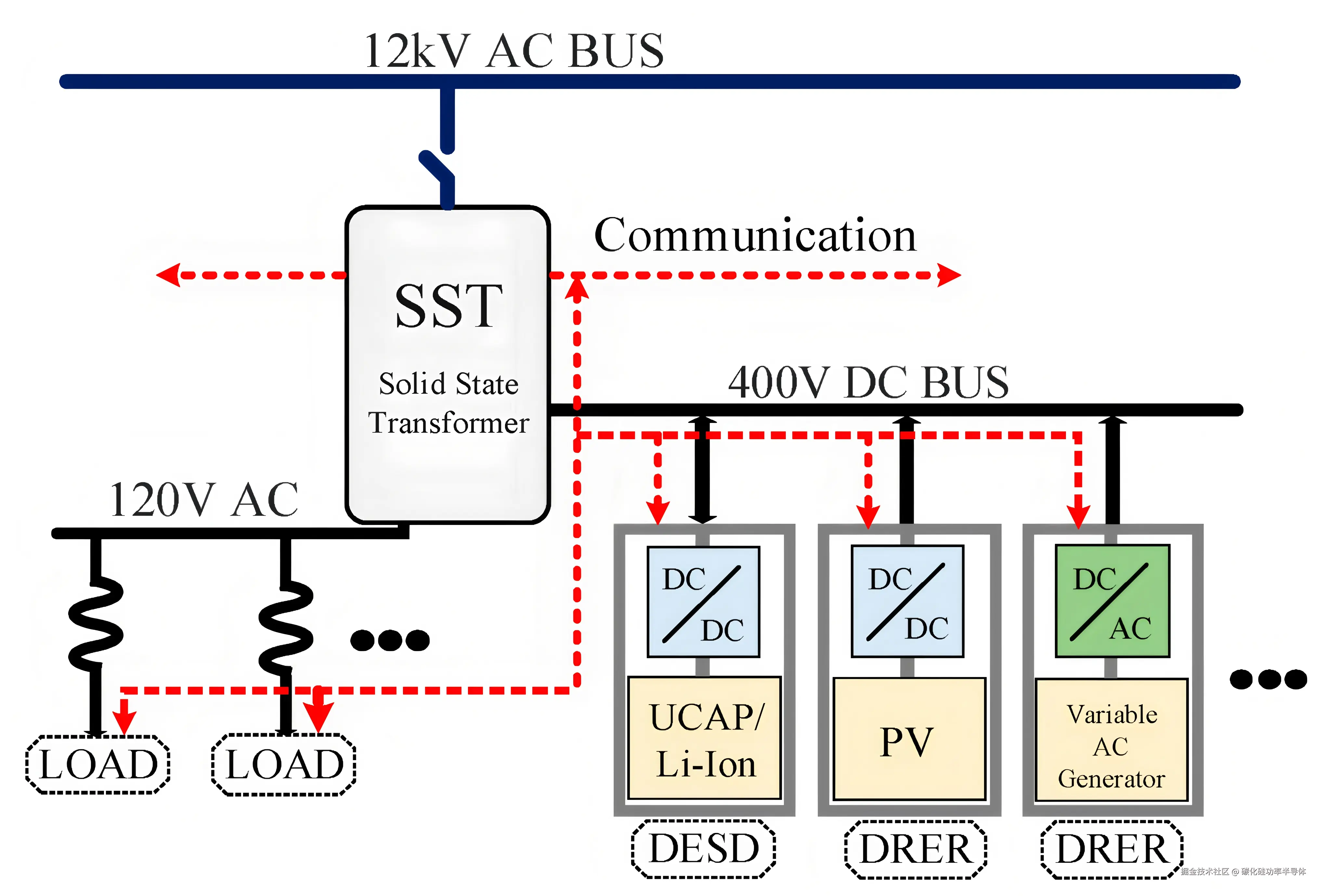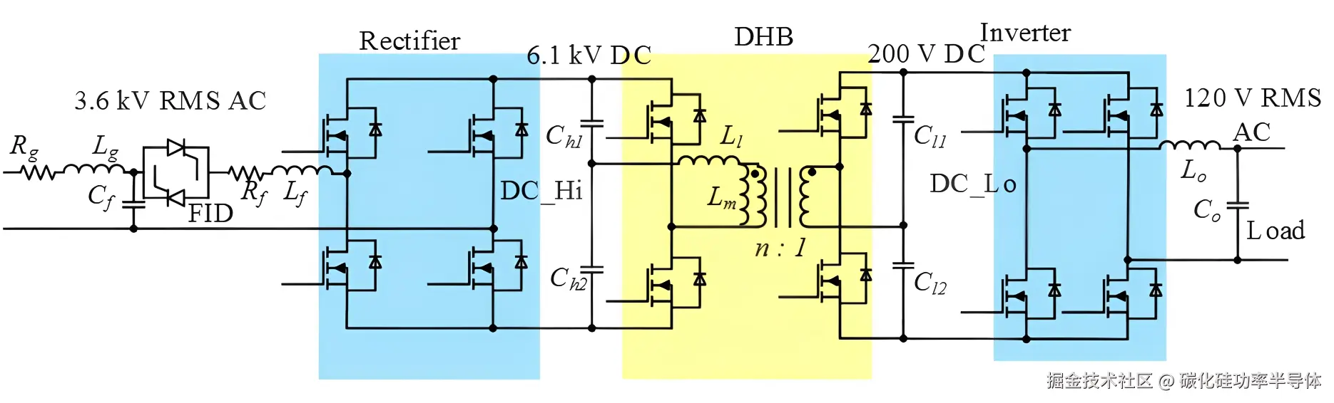 隔离级(DC/DC) :这是SST的核心,负责将高压直流降压并实现电气隔离。该级通过高频工作(通常在20kHz-100kHz)来大幅减小变压器体积,是体现SST小型化优势的关键 。