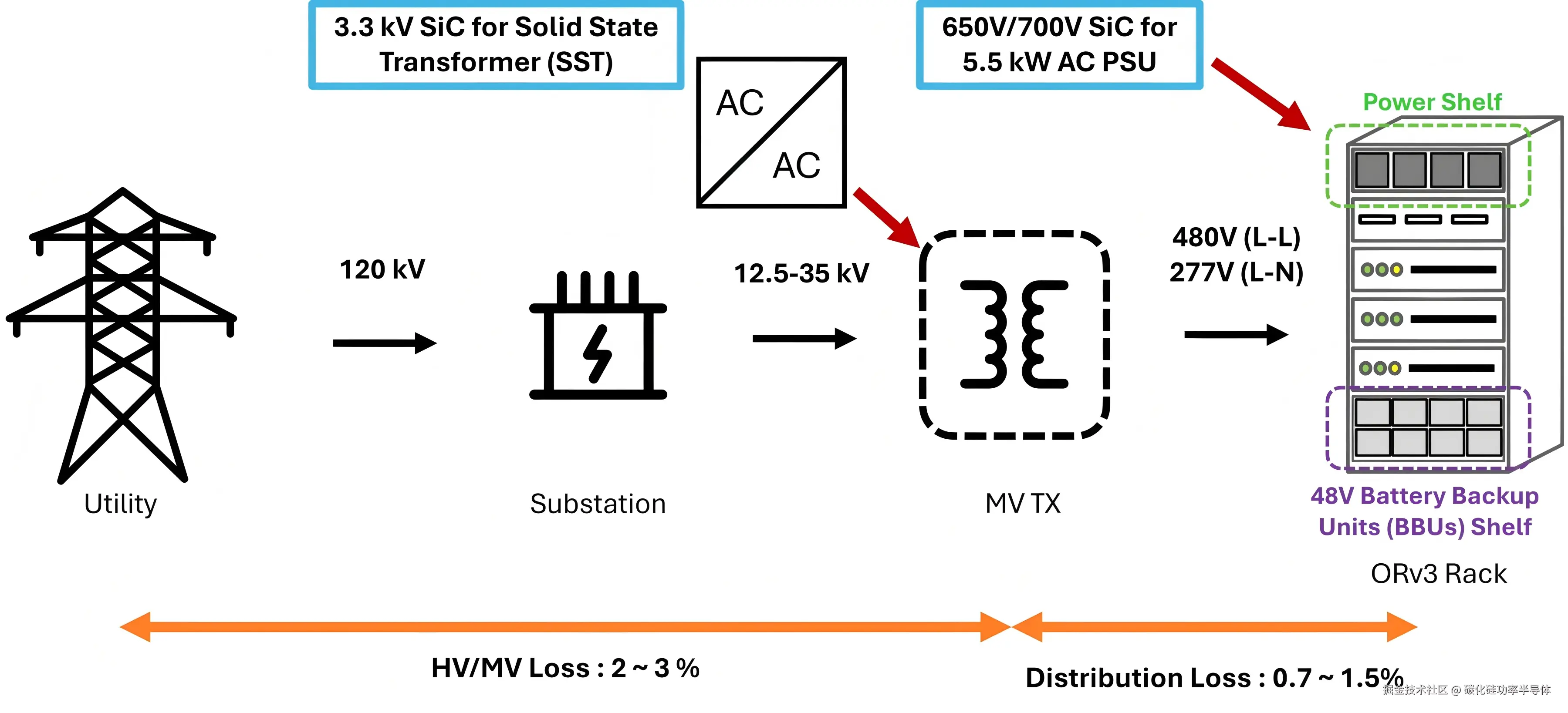 优化集成高压直流(HVDC)系统:SST可直接将10kVac转换为800Vdc或±375Vdc,从而取代传统供电架构中多级AC-DC转换环节,简化供电链路,显著提升系统能效,减少设备冗余,并节省占地面积 。