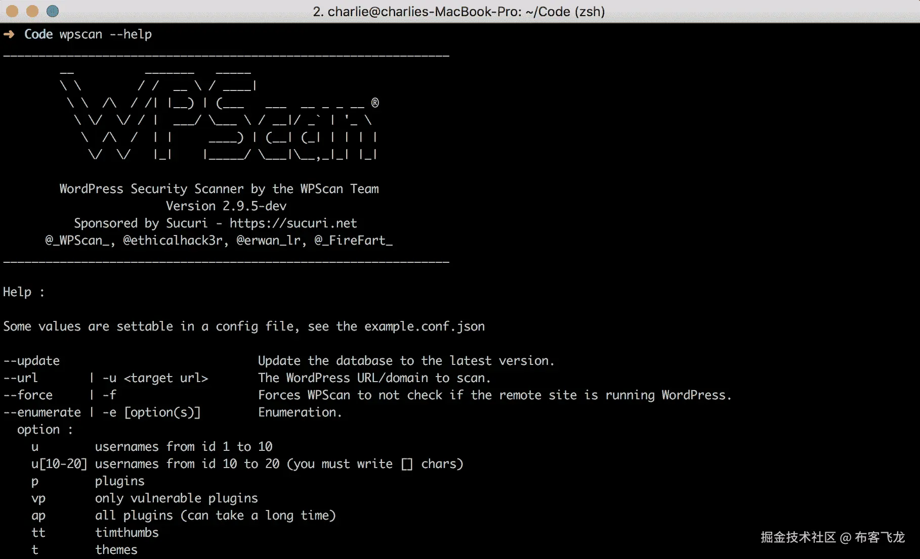 然后,你拥有所有必要的依赖项,可以使用docker run命令启动wpscan CLI。这里有一个直接来自 Docker Hub 镜像文档的示例单行命令: