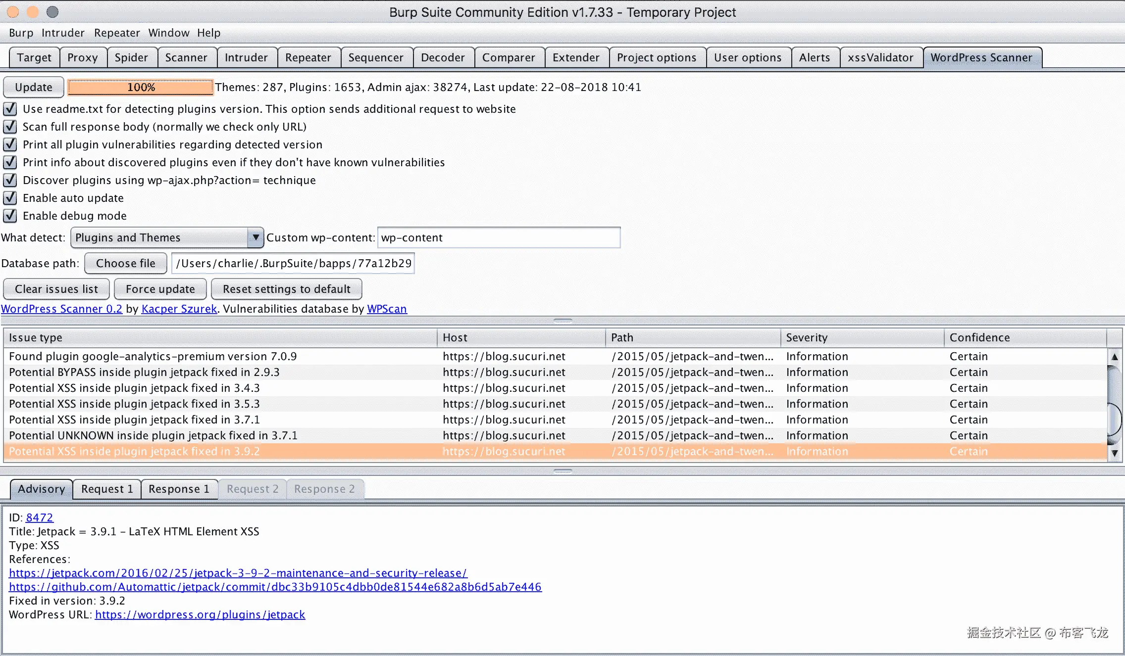 wpscanCLI 允许更好地与现有的自动化套件集成,但 Burp 扩展更好地支持被动扫描功能。 -