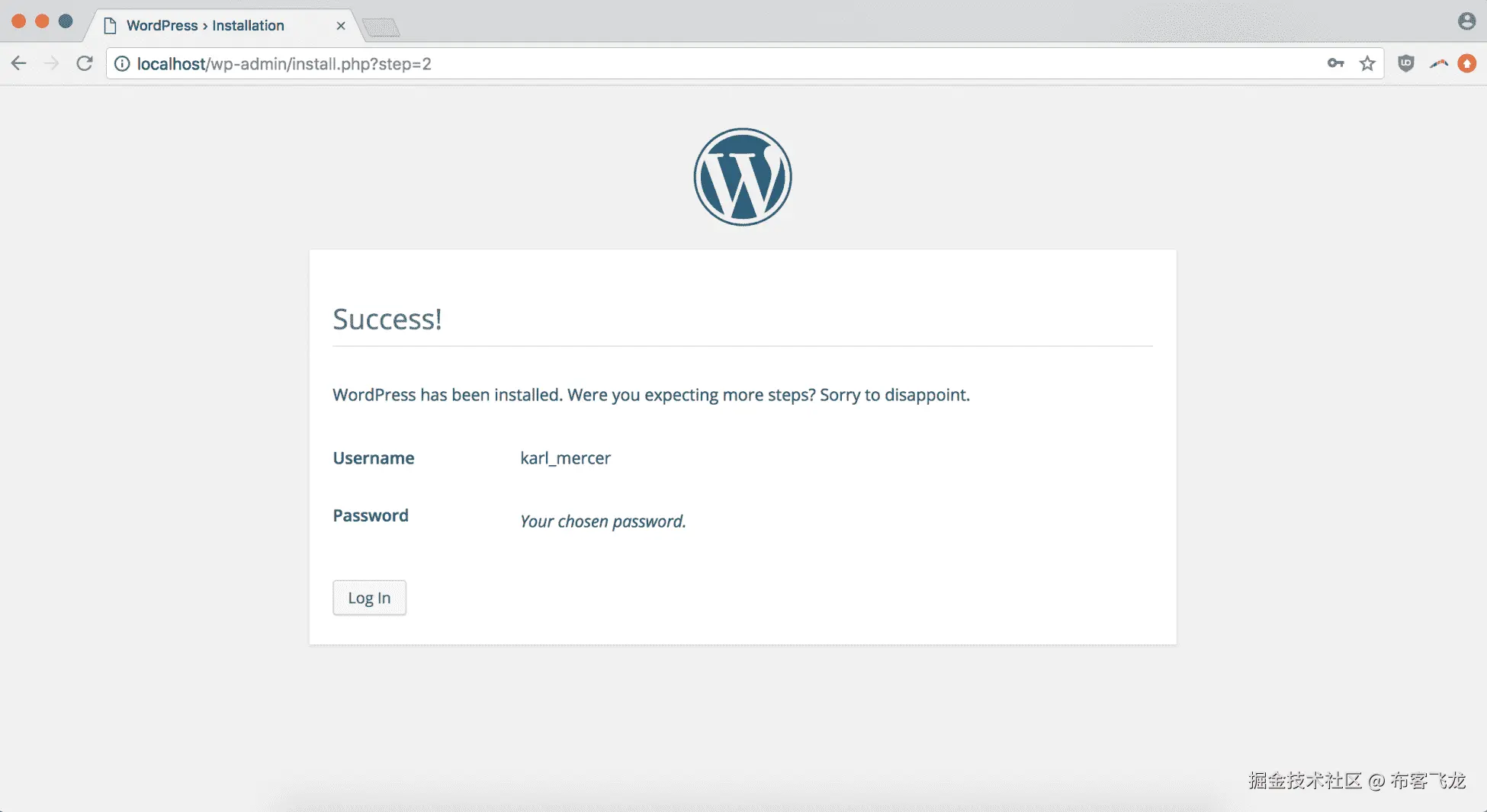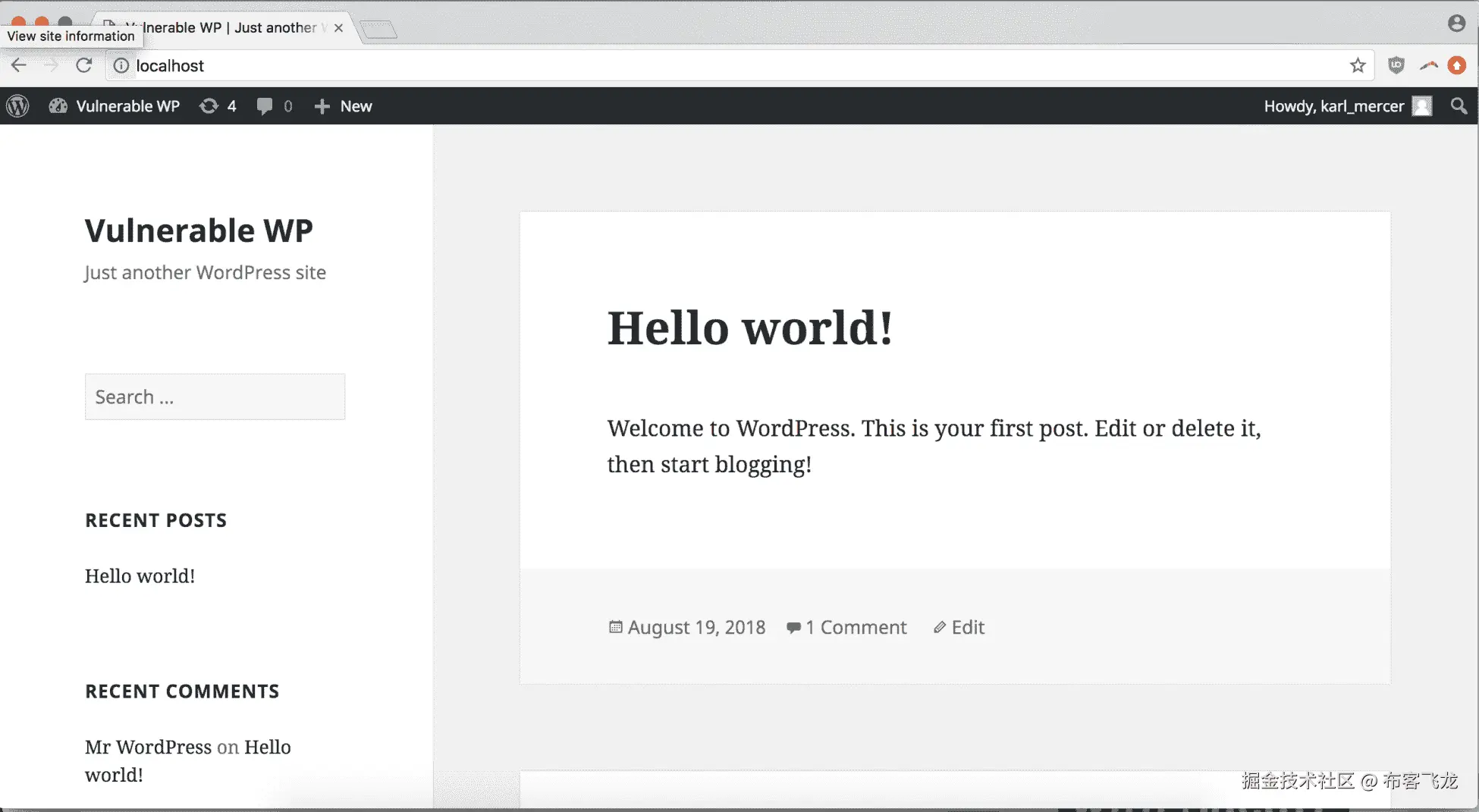 第一次登录后,导航到普通的localhost:80,查看你 WP 站点的实际主页: