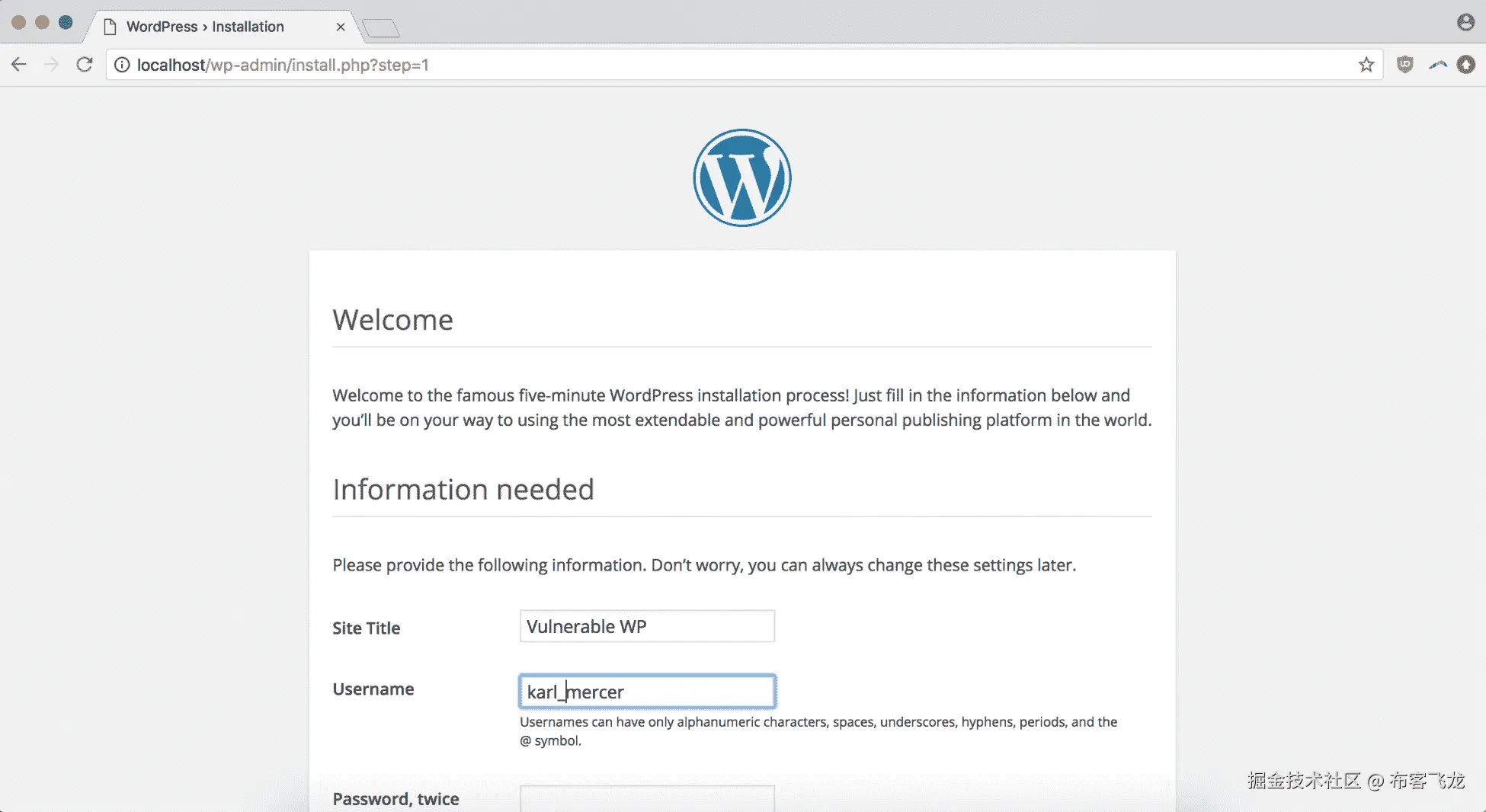 现在,为了测试这个功能,让我们启动我们的脆弱 WordPress 实例。如果你按照了我们技术要求部分的说明,你应该已经有一个准备好在localhost:80上设置的 WP 实例了。选择你希望使用的语言后,你应该会看到一个用于填写基本站点信息的表单(站点标题、管理员超级用户名、通知邮件等):
