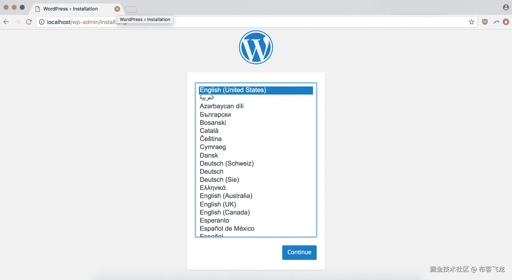现在,你应该有一个准备好在localhost:80进行设置的 WordPress 安装: