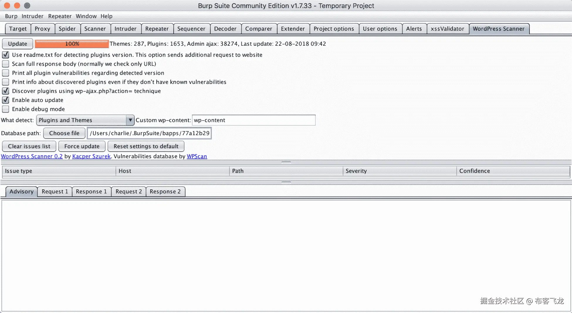 WPScanner 扩展依赖于 Burp 在你使用代理浏览器浏览网站时进行的被动分析。在点击几个页面、查看我们的示例文章并打开我们脆弱的 WP 实例的评论提交字段后,我们可以看到问题列表已经被多个漏洞填充: