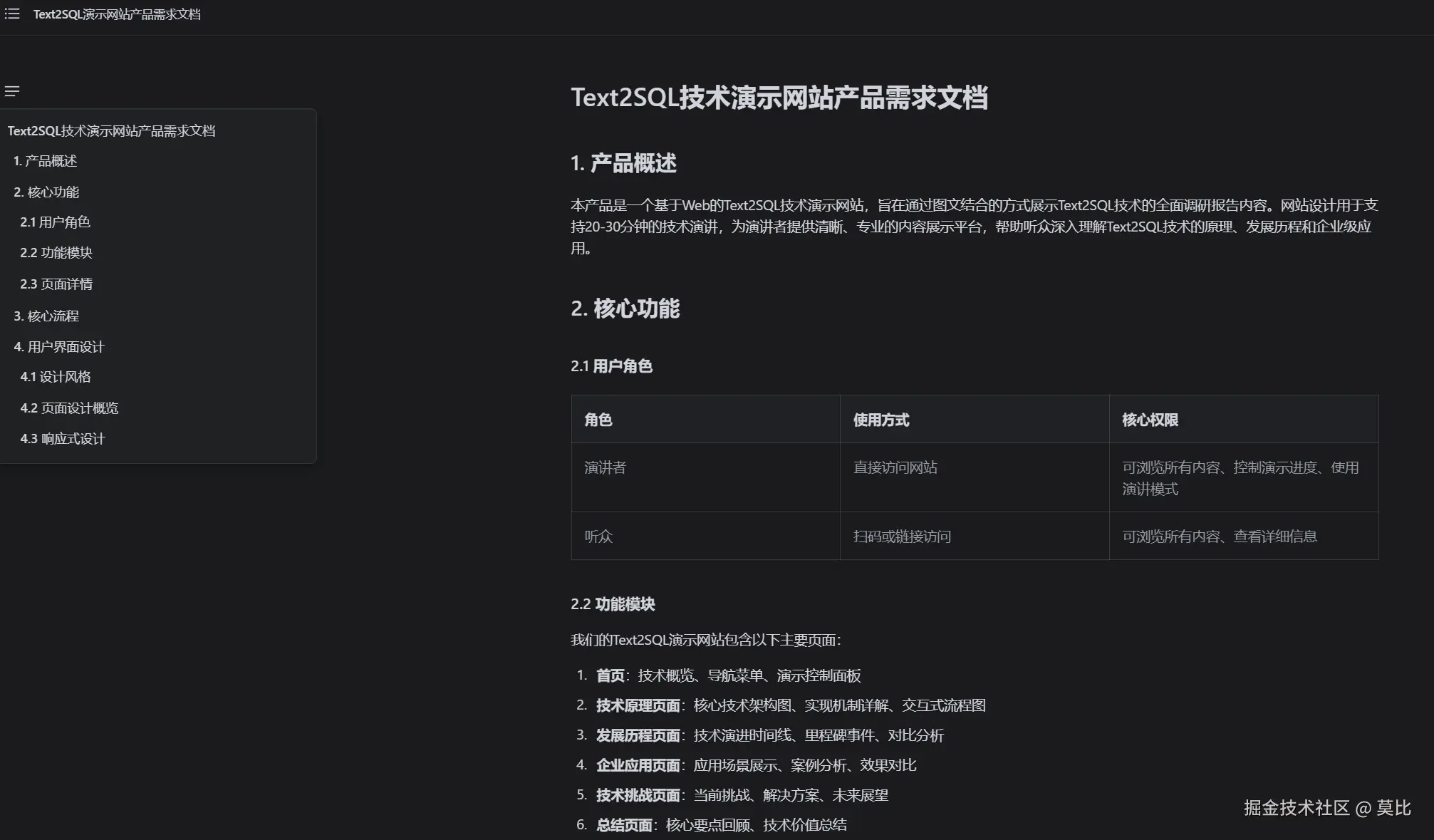 - Text2SQL技术演示网站产品需求文档.md (明确站点功能、页面结构、交互逻辑)