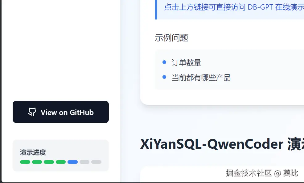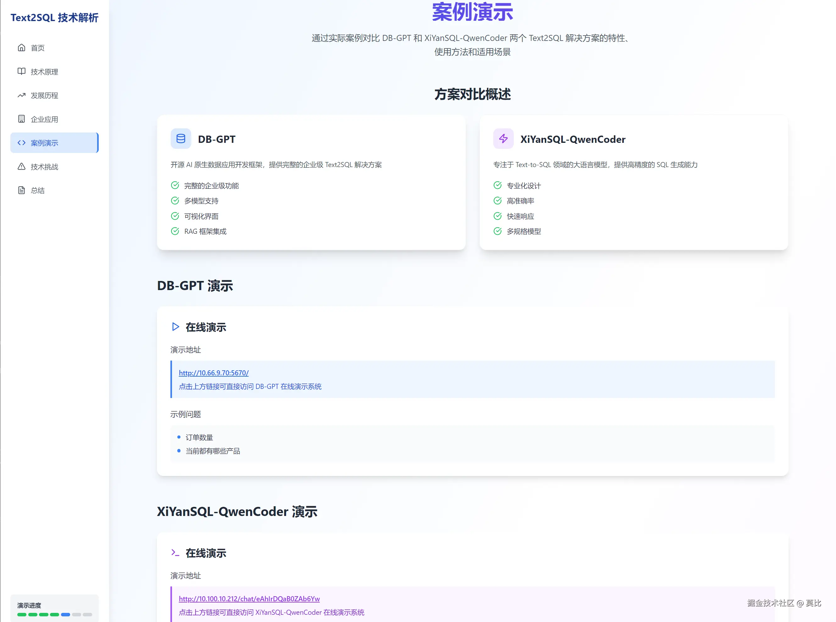 为了让分享更具说服力,我希望增加一个 “案例演示” 页面,结合本地实现的 Text2SQL 功能,给听众做在线实机演示。具体操作分 3 步: