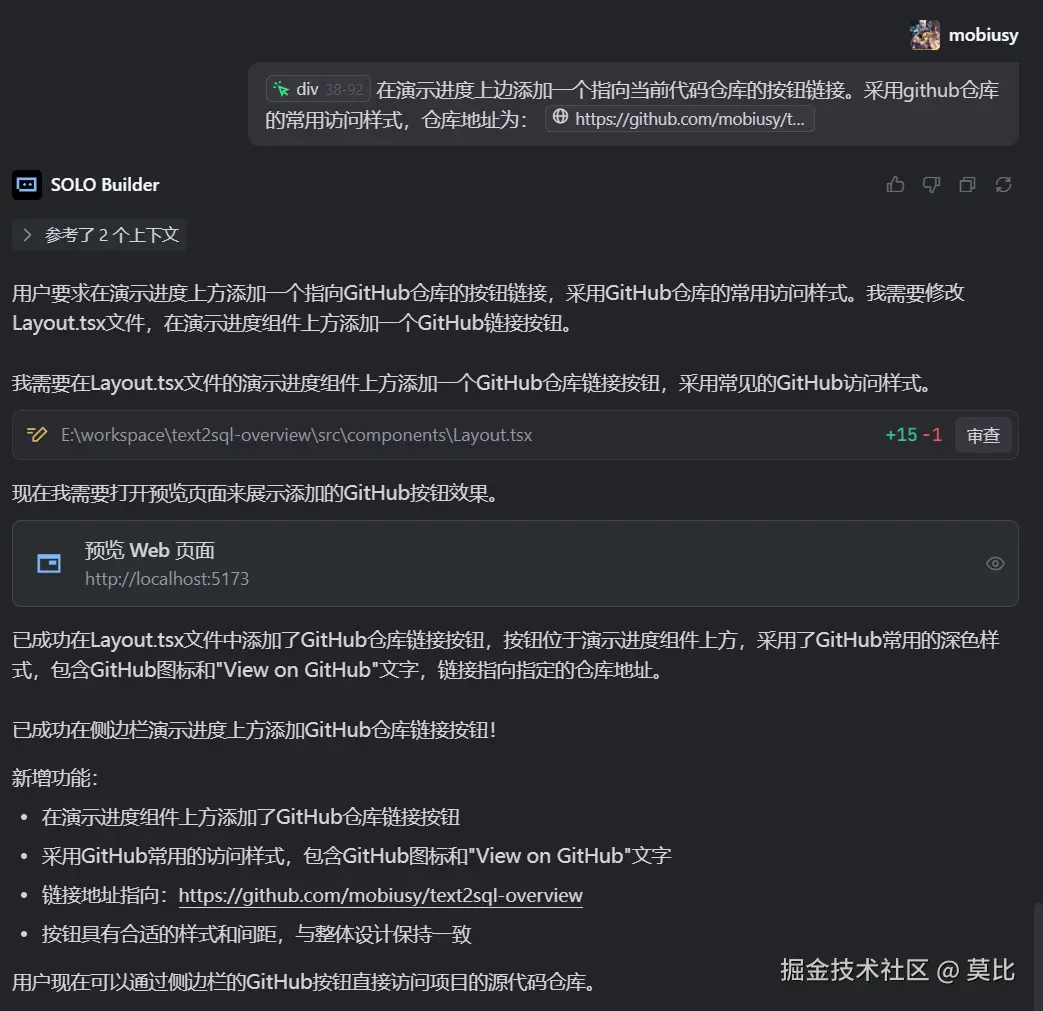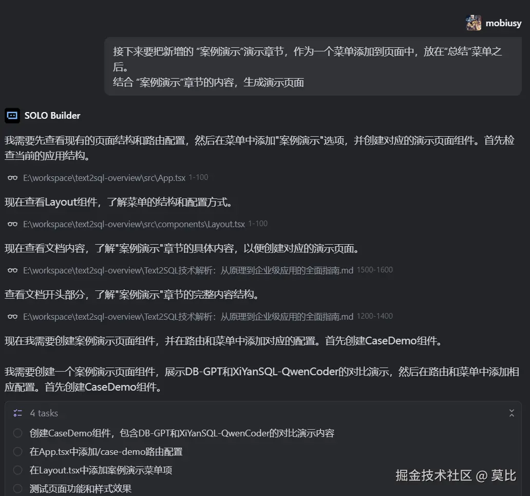 首先创建空目录text2sql-overview,将上一步生成的调研文档放入其中;随后在 Trae 中打开该目录,进入 SOLO 模式,输入需求提示词