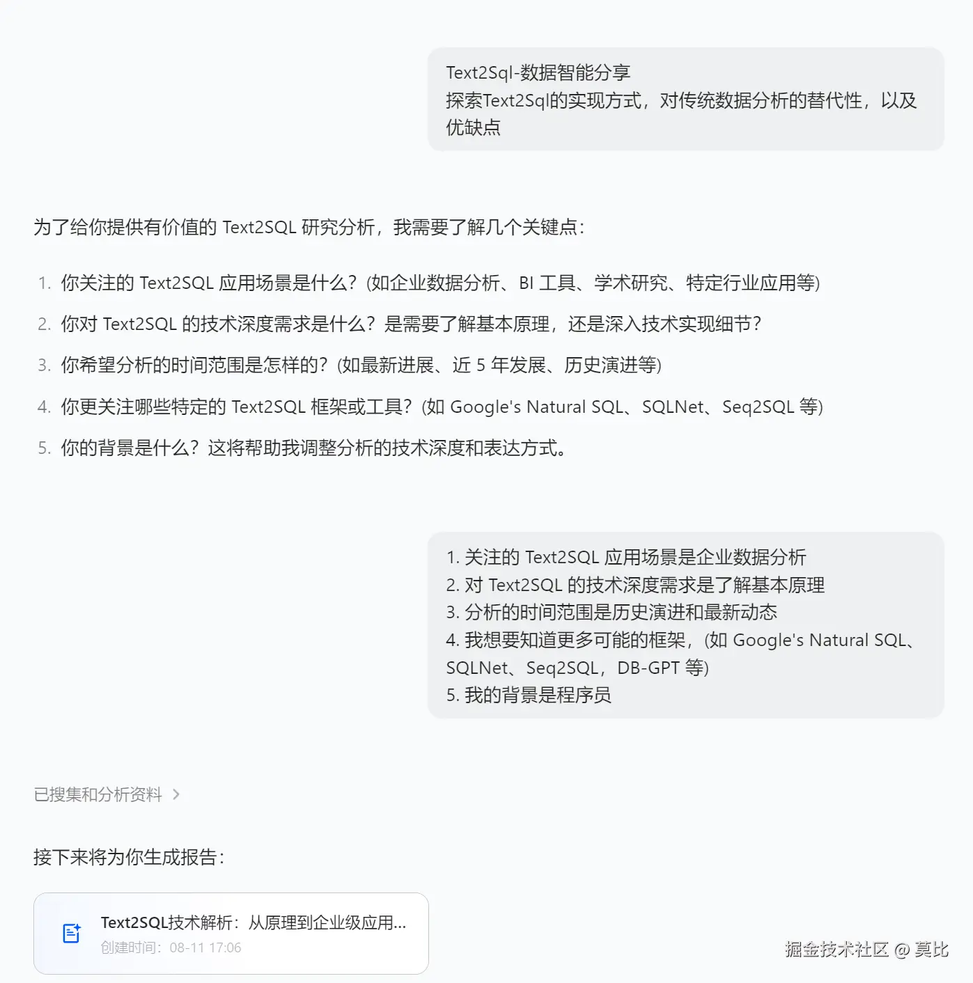 - 资料收集阶段:整理 Text2SQL 相关技术内容,形成一份逻辑完整、信息准确的调研文档;