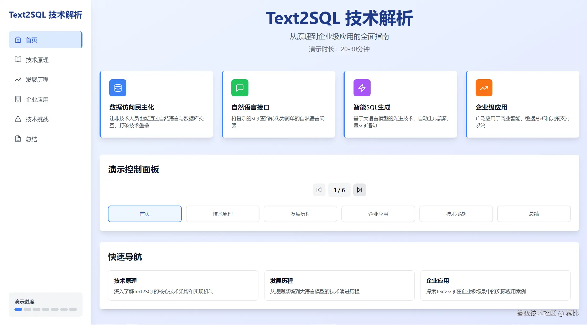 我要为公司的员工做一次Text2SQL的技术分享,分享的时长大概20-30分钟,请基于“Text2SQL技术解析:从原理到企业级应用的全面指南.md"的内容,生成精美的交互式web页面。