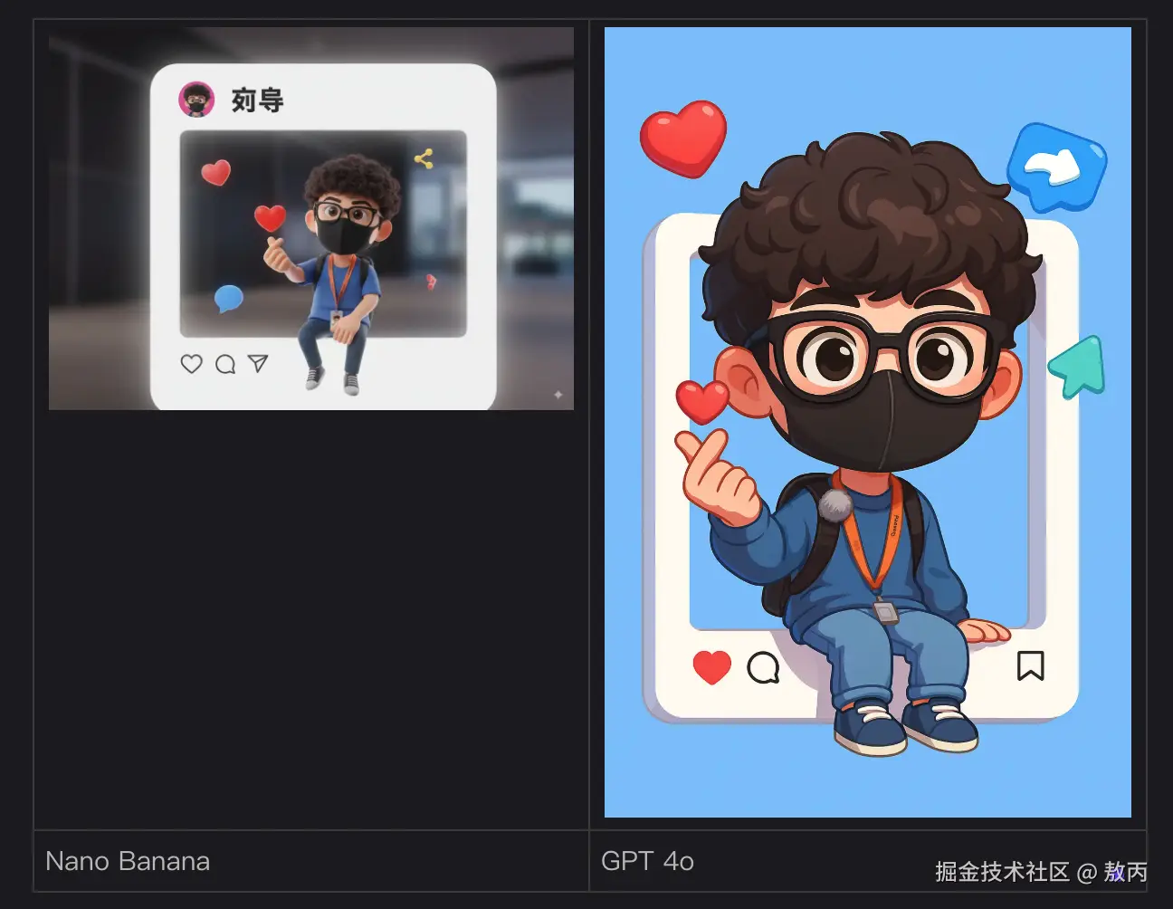 可以看到同样地提示词,默认的配置下 Nano Banana 生成的效果更真实和立体一些,但是汉字存在乱码;GPT 4o 效果也蛮不错但是偏卡通,但是有些指令没有被遵循,如相框顶部的「敖丙」字样并没有在图片中画出来。