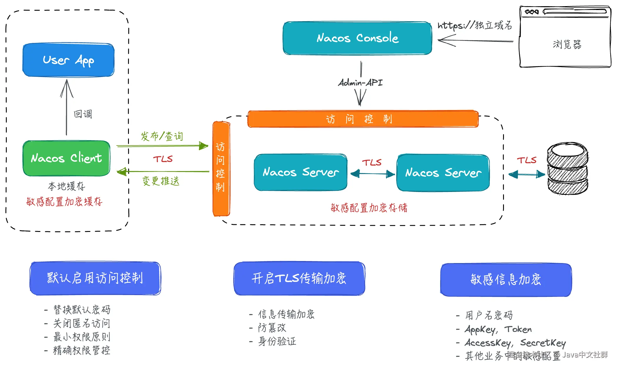 同时配合配置加密插件,TLS 传输,来实现 Nacos 3.0 的零信任安全架构: