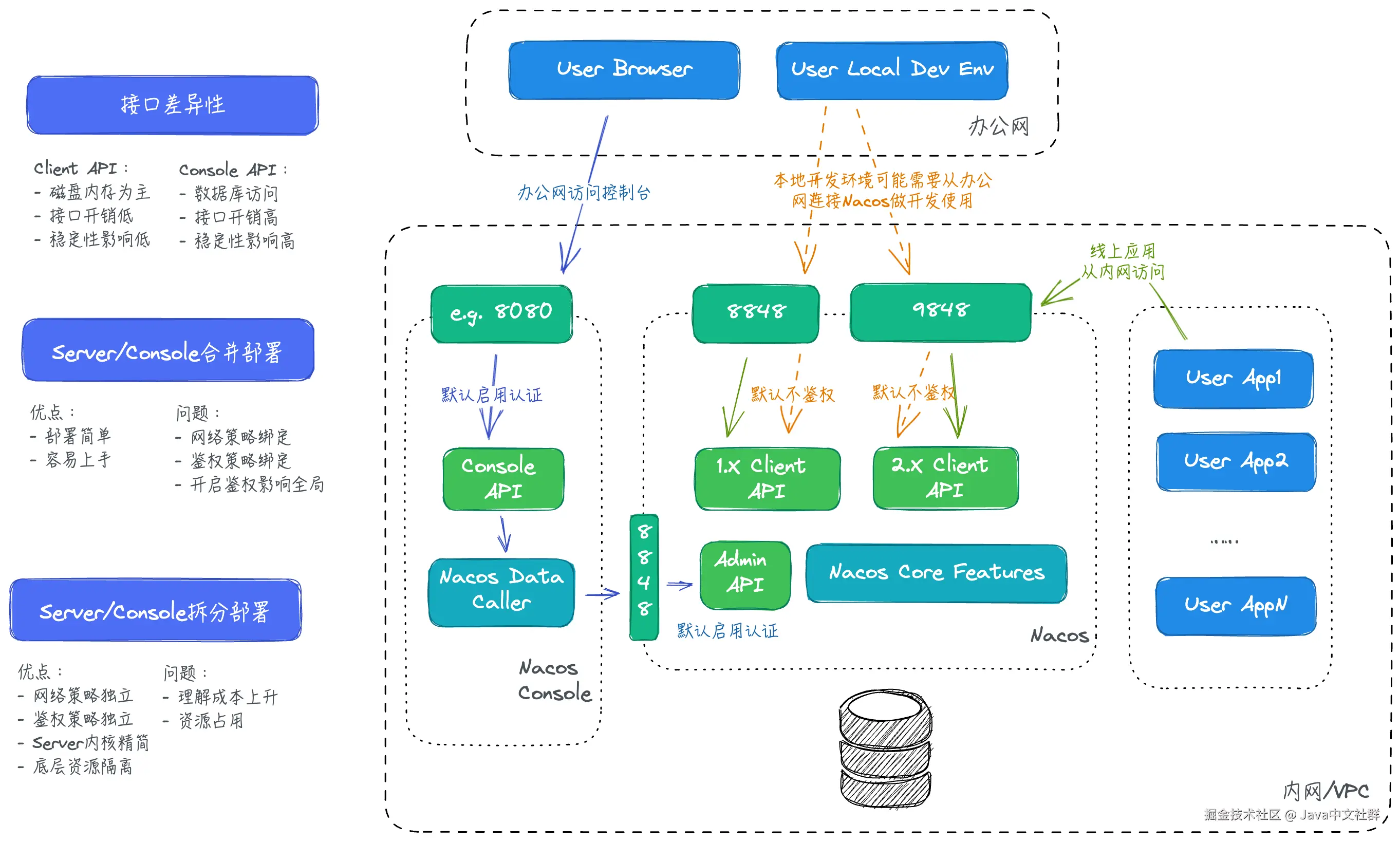 Nacos 3.0 为了解决这个问题,从 Nacos 的部署架构上作出演进,独立控制台部署,拆分鉴权开关,分类 API 并默认开启控制台及管控类 API 的鉴权: