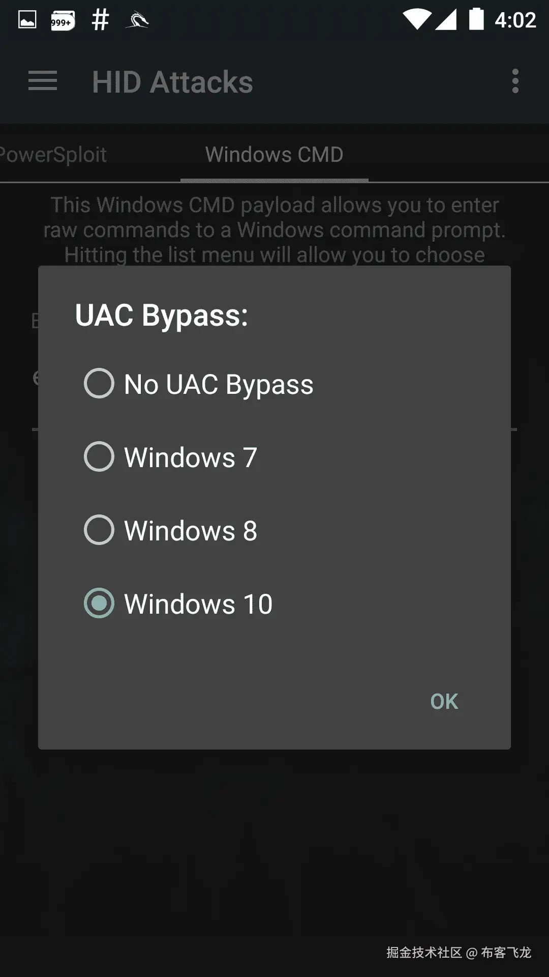 NetHunter 具有一个功能,允许我们将我们的设备和 OTG 电缆行为键盘,因此可以在任何连接的 PC 上键入任何给定的命令。这使我们能够执行 HID 攻击。