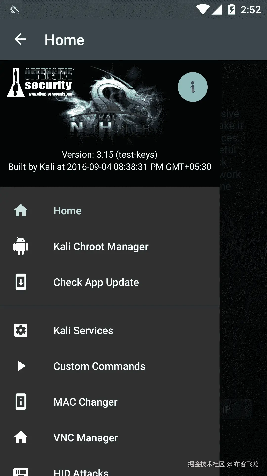 “Kali NetHunter 是一个包括强大的移动渗透测试平台的 Android ROM 叠加层。该叠加层包括自定义内核、Kali Linux chroot 和一个配套的 Android 应用程序,可以更轻松地与各种安全工具和攻击进行交互。除了 Kali Linux 中的渗透测试工具库外,NetHunter 还支持几个其他类别,如HID 键盘攻击、BadUSB 攻击、Evil AP MANA 攻击等等。有关组成 NetHunter 的各个部分的更多信息,请查看我们的 NetHunter 组件页面。NetHunter 是由 Offensive Security 和社区开发的开源项目。”