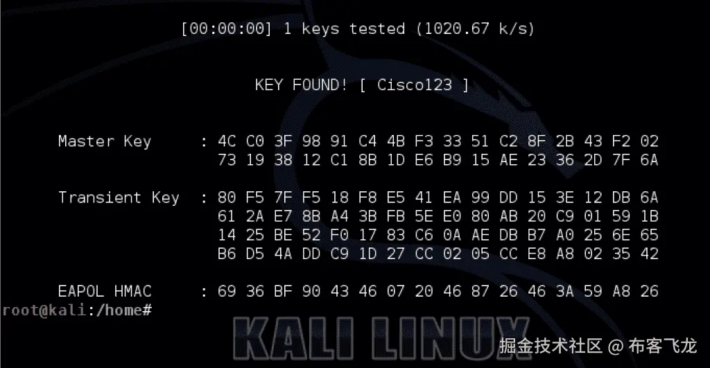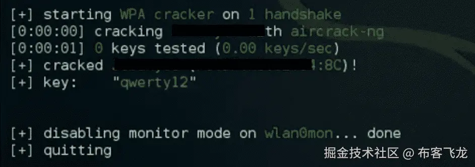 - 我们应该看到 Aircrack 窗口,当密码被破解时它会显示给我们:
