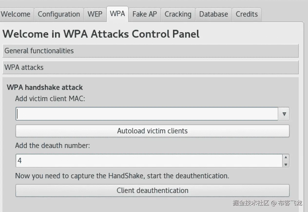 - 由于 WPA 攻击需要捕获握手,我们需要一个站点已连接到接入点。因此,我们点击“自动加载受害者客户端”或输入自定义受害者 MAC: