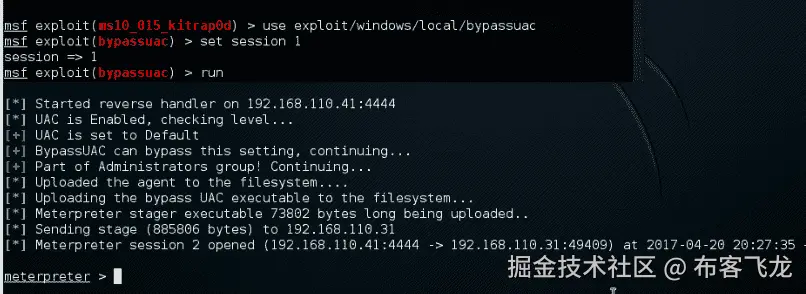 - 我们从 UAC Bypass 菜单中选择 Windows 10,然后输入一个简单的命令: