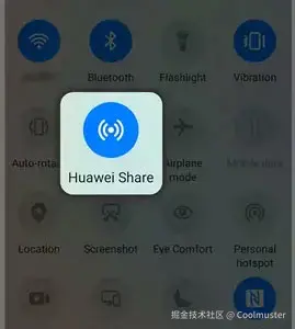 - 从两部手机屏幕顶部向下滑动,打开通知面板。找到Huawei Share图标并点击以启用该功能。启用 Huawei Share 后,系统将自动打开 Wi-Fi 和蓝牙,这是连接所必需的。