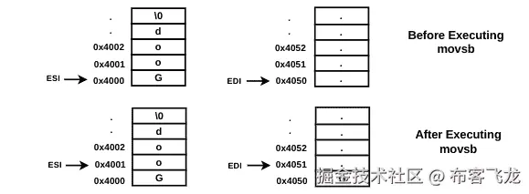 以下截图将帮助你理解在执行 movsb 指令之前和之后发生了什么。若使用的是 movsw 而非 movsb,则会将 2 字节从 src 复制到 dst,同时 esi 和 edi 会各自增加 2: