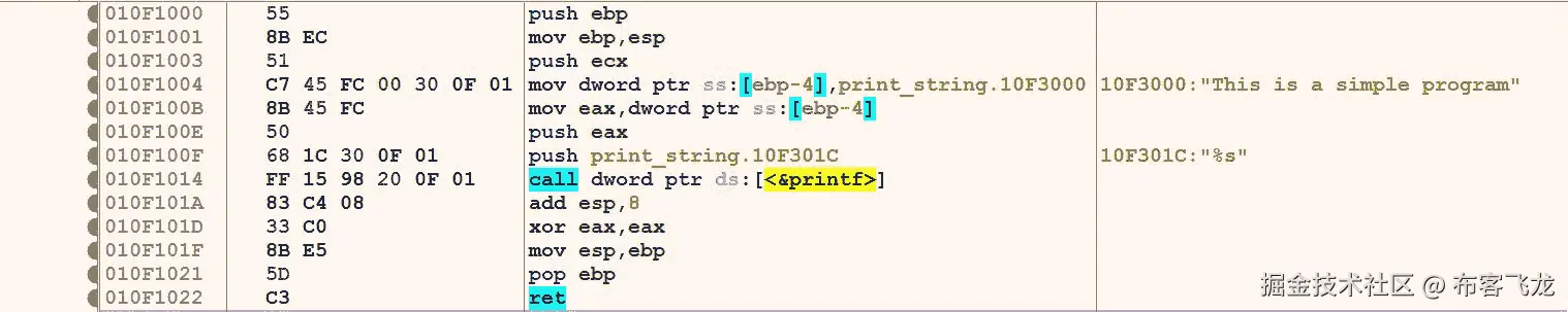 以下是为 32 位(x86)处理器编译的 C 代码的反汇编;在这种情况下,所有参数都按逆序推送到栈上,在调用printf后,使用add esp,18h来清理栈。因此,很容易判断printf函数有六个参数: