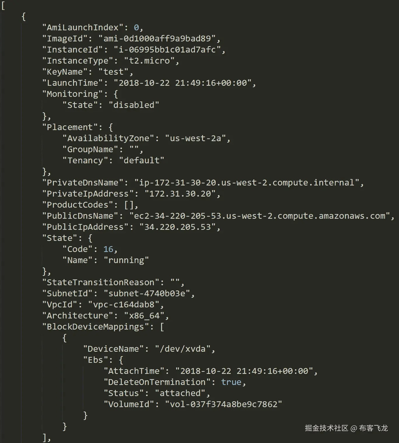 在当前目录中应该创建一个名为ec2-instances.json的新文件,当您打开它时,您应该看到类似以下截图的内容,其中列出了us-west-2区域中所有 EC2 实例的 JSON 表示。这些 JSON 数据包含有关 EC2 实例的基本信息,包括标识信息、网络信息和适用于 EC2 实例的其他配置。但是,这些细节目前并不重要: