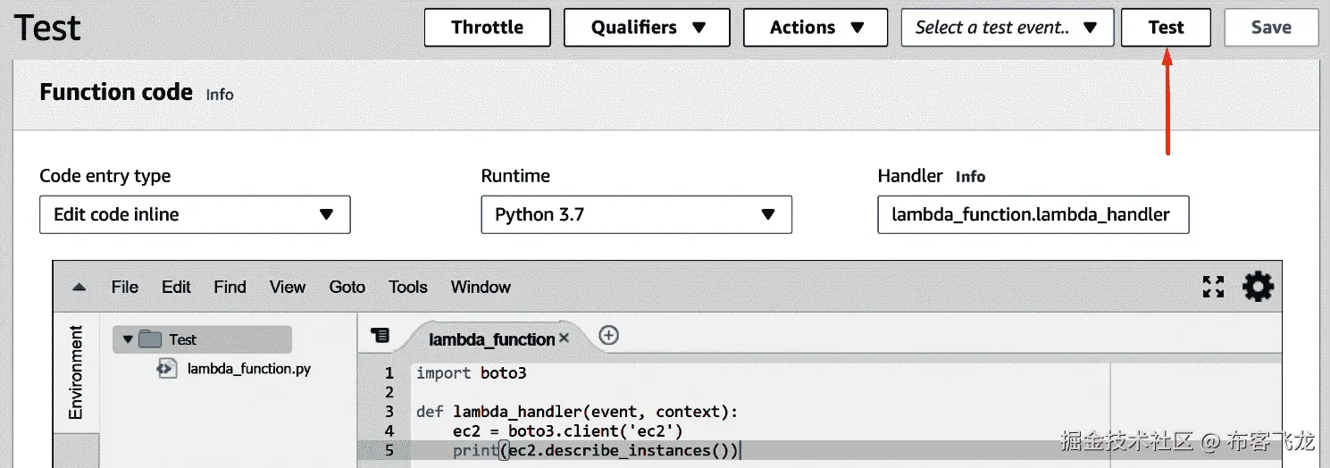 这段代码创建了一个新的boto3 session,并将在计算机上搜索名为Test的 AWS CLI 配置文件,这是我们已经设置好的。通过使用这种方法来处理我们脚本中的凭据,我们不需要直接在代码中包含硬编码的凭据。