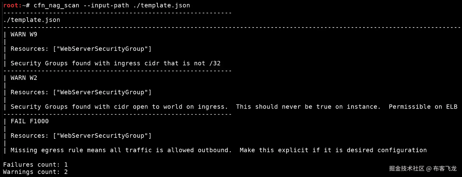 输出显示,我们扫描的模板输出了1个失败和2个警告。所有三个都与"WebServerSecurityGroup"及其入站/出站规则集相关联。两个警告是关于允许通过该安全组的入站规则过于宽松,但如果该安全组还定义了 SSH 入站规则,那么这两个警告出现是有道理的。这是因为我们知道允许从0.0.0.0/0范围访问 SSH 入站,这不是/32 IP 范围,这意味着允许世界访问。即使有了这些信息,手动检查仍然是值得的。