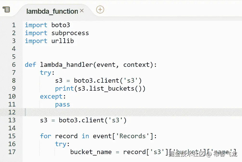 我们将在已经创建的现有脚本的底部添加以下代码。首先,我们将想要弄清楚账户中有哪些S3存储桶,因此我们需要设置一个新的boto3客户端来定位S3: