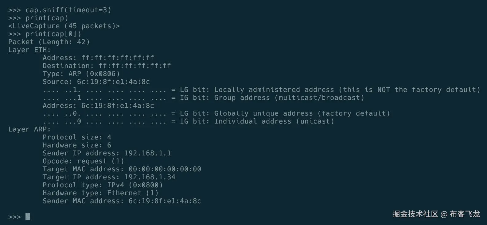 - 我们可以按如下方式打印嗅探到的数据包中的