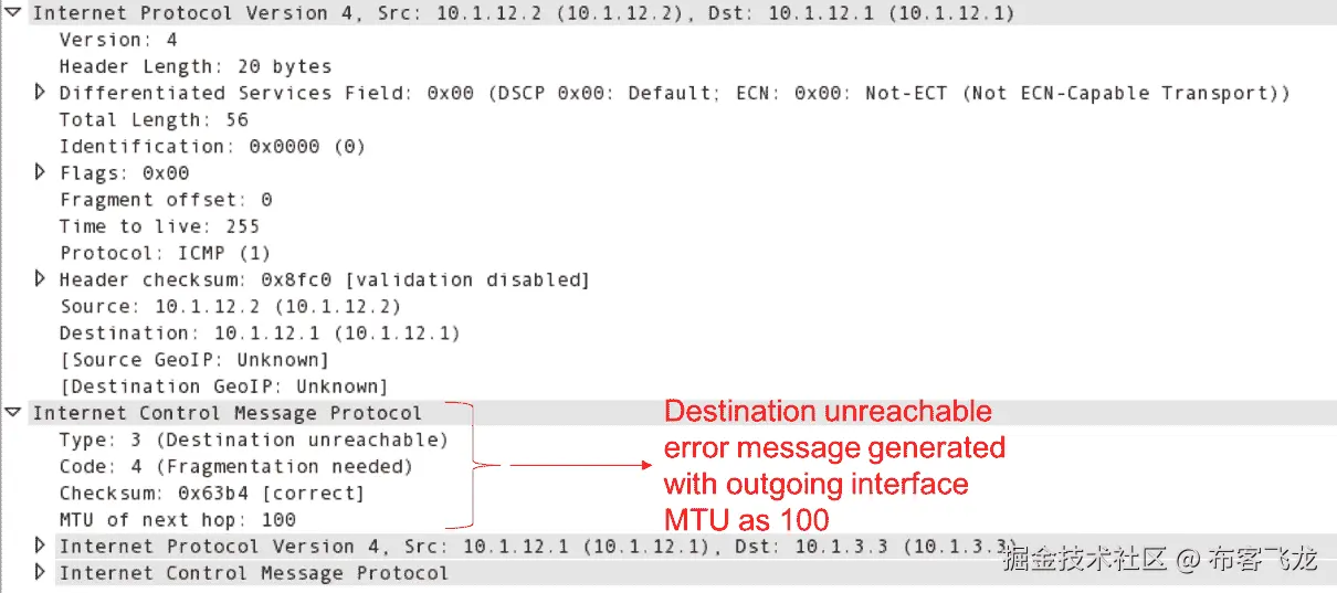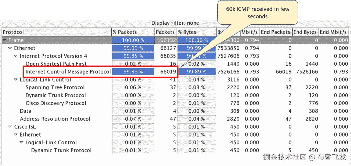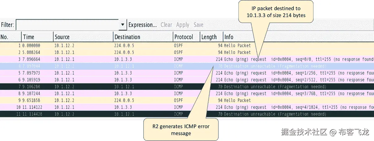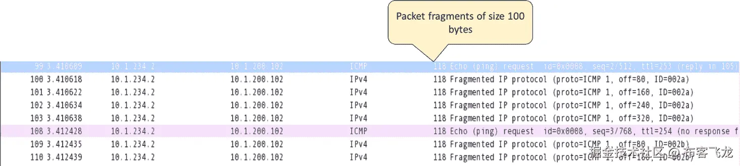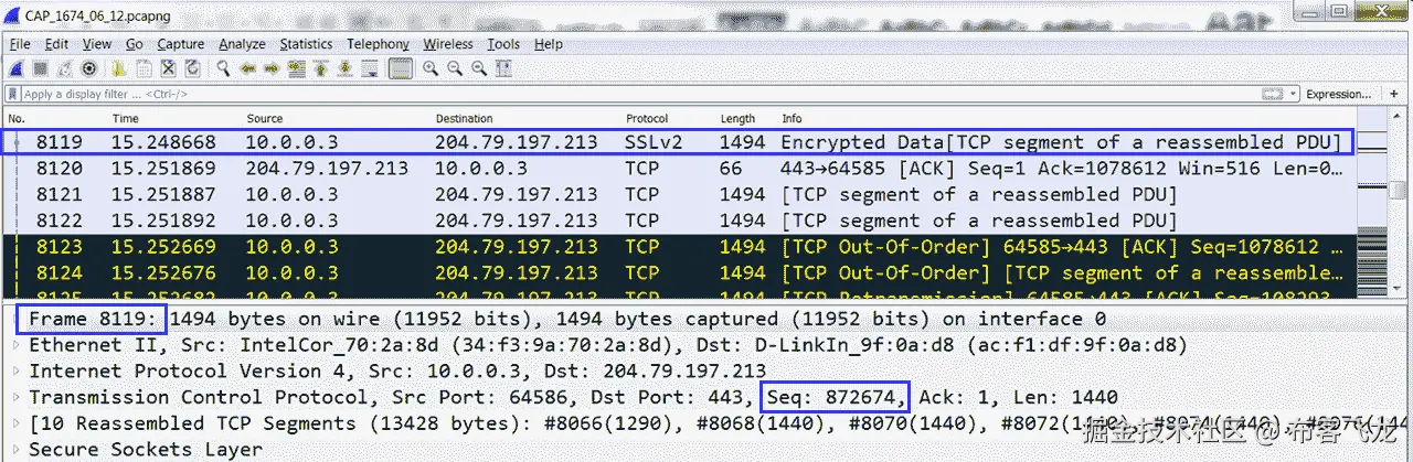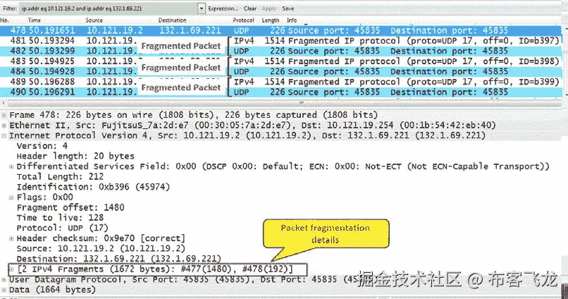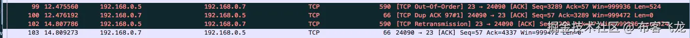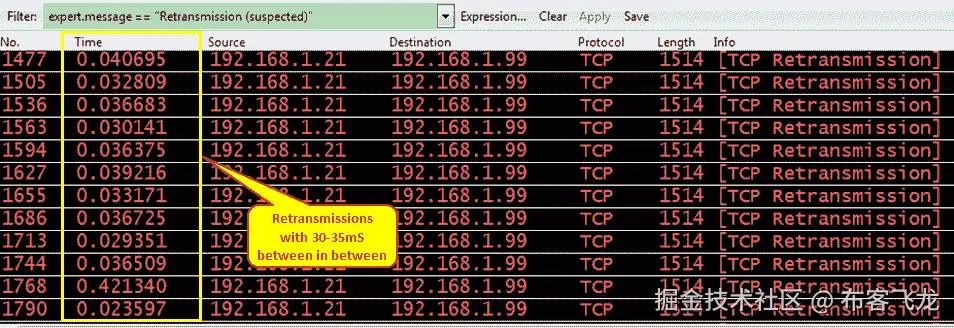 [TCP Retransmission]丢失数据段的实例,网络中可能会有一些数据包丢失。使用ping等网络连接检查工具来验证底层网络的健康状况。或者,在网络中的多个捕获点上捕获流将有助于缩小丢弃节点的范围。