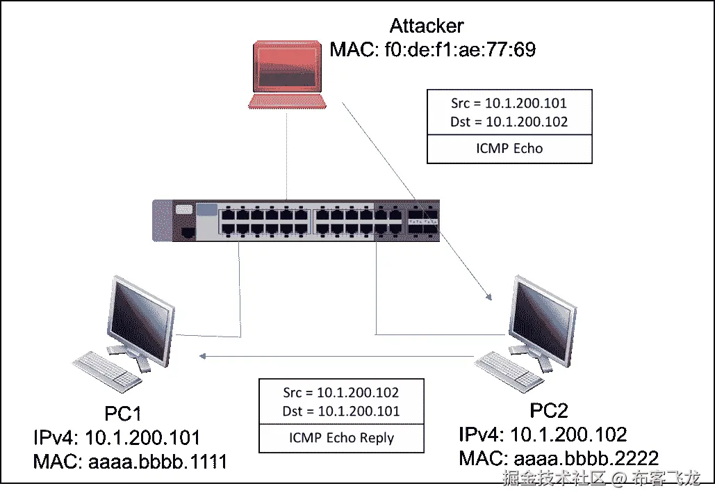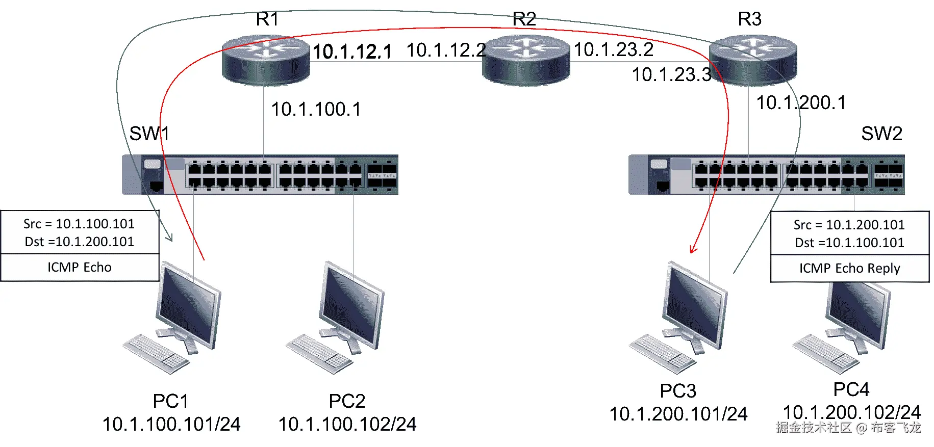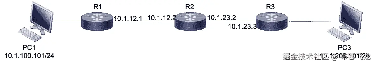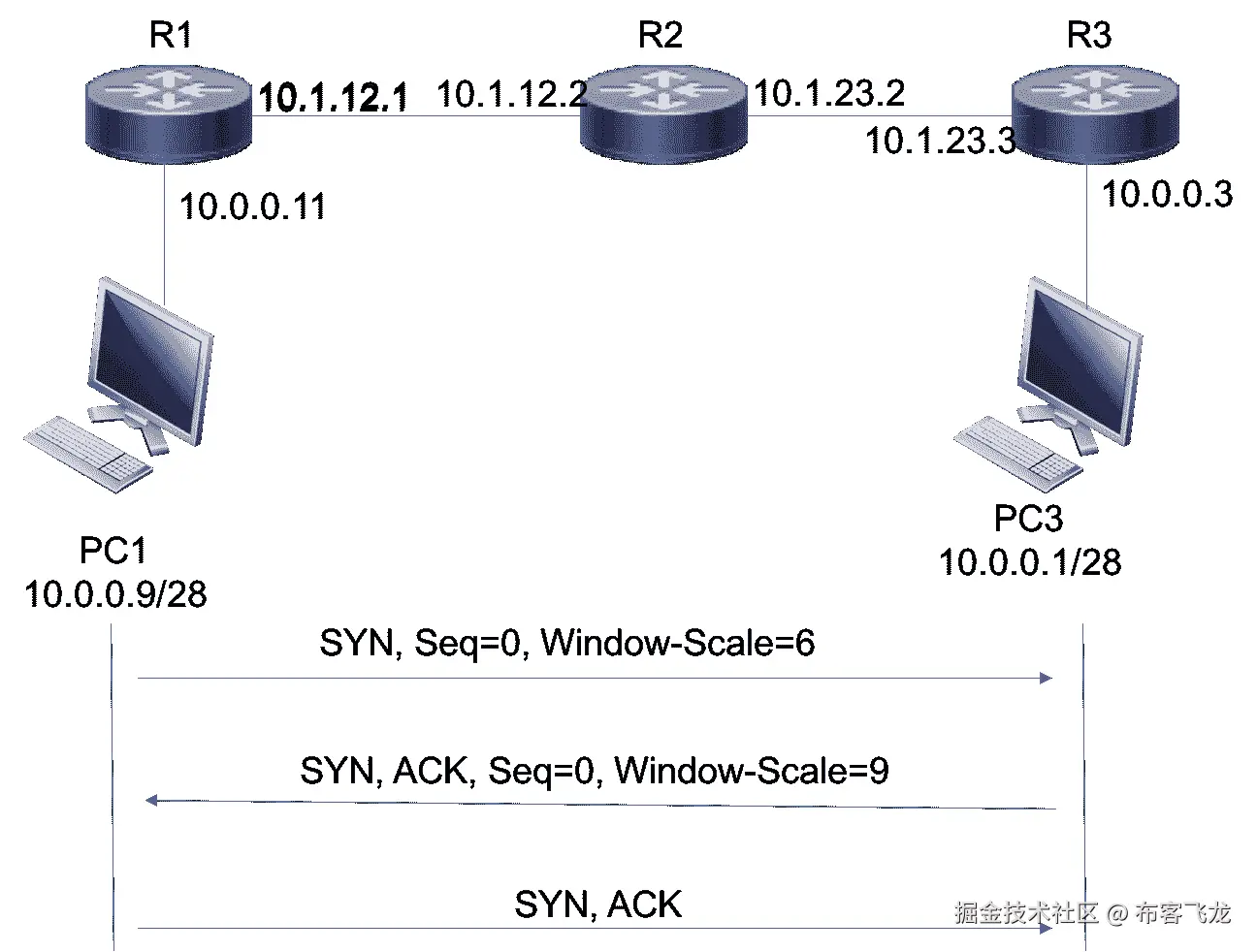 在以下拓扑中,PC1 正在与 PC3 建立 TCP 会话以传输数据。