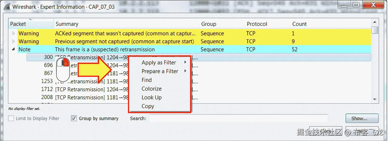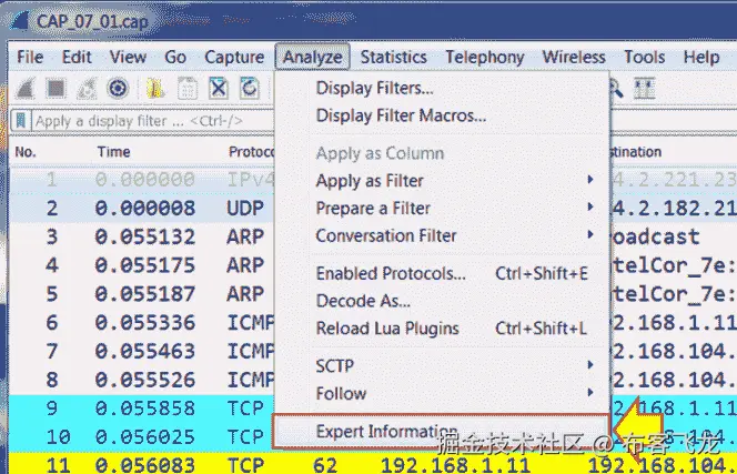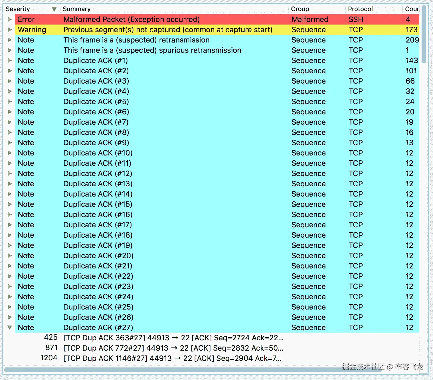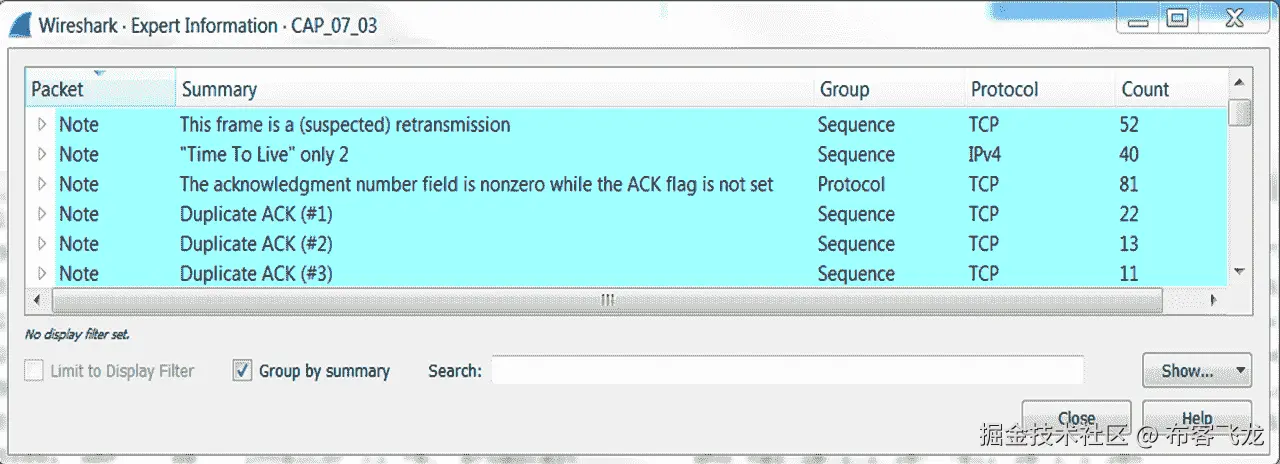 - 在上图中,可以注意到有 173 个缺失数据段的实例和多个重复数据段的实例。专家信息将帮助我们提供诸如无序段、连接重置、零窗口等错误。