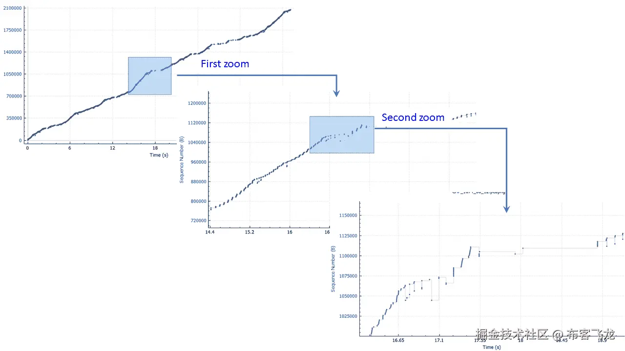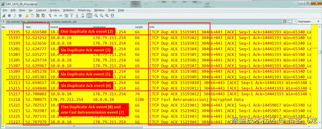 对于重复确认,我们在 52.61 秒看到一个事件( 2 ,在 52.62 秒看到六个事件( 3 ,在 52.68 秒看到两个事件( 5 ,在 52.69 秒看到两个事件( 6 ,在 52.60 秒,我们看到五个重复确认( 8 事件)和一个快速重传事件( 7 )。