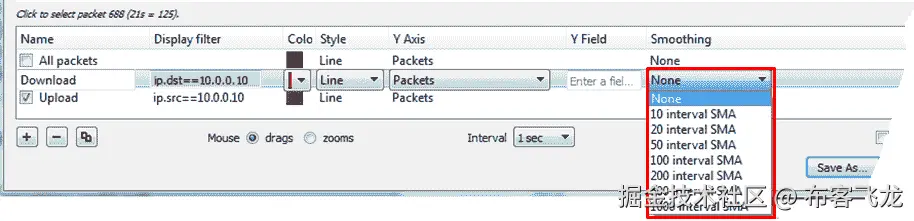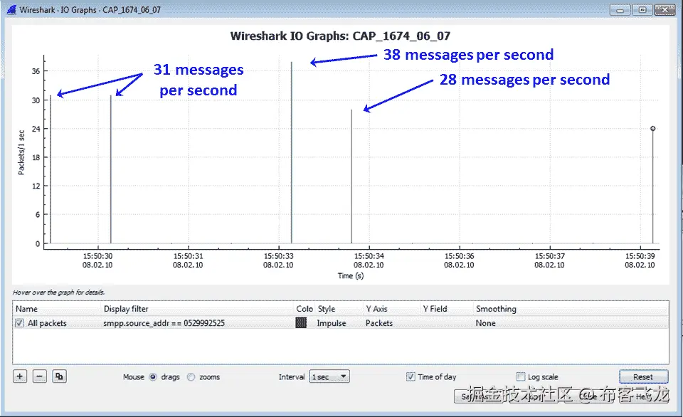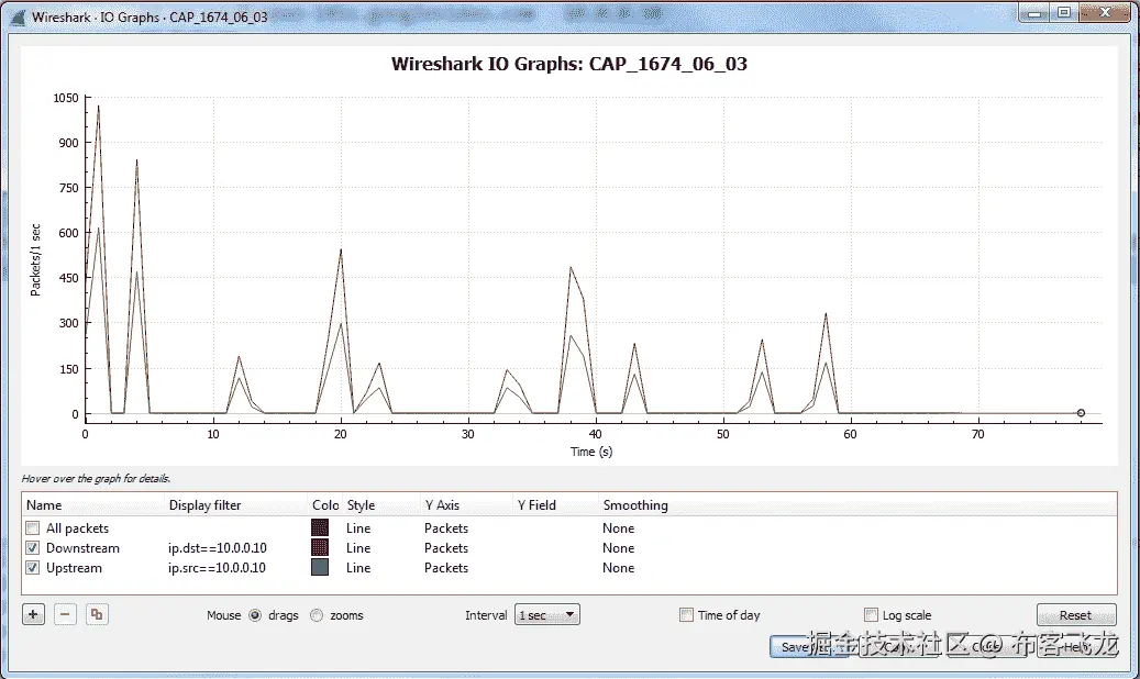 例如,如果当 x 轴被配置为 1 秒的间隔时,我们获得每秒 1000 个包的峰值,这意味着在最后一秒,我们已经接收了 1000 个包。当我们将 x 轴更改为 0.1 秒间隔时,峰值会有所不同,因为现在我们可以看到在过去的 0.1 秒内捕获了多少个数据包。