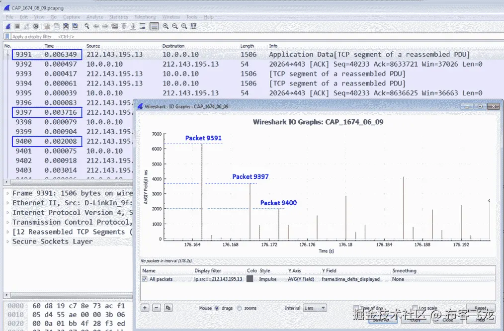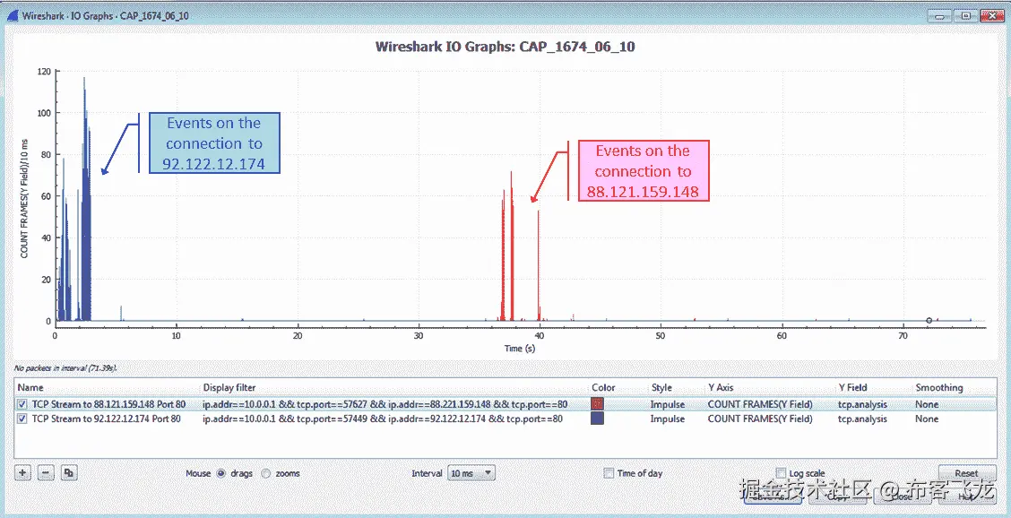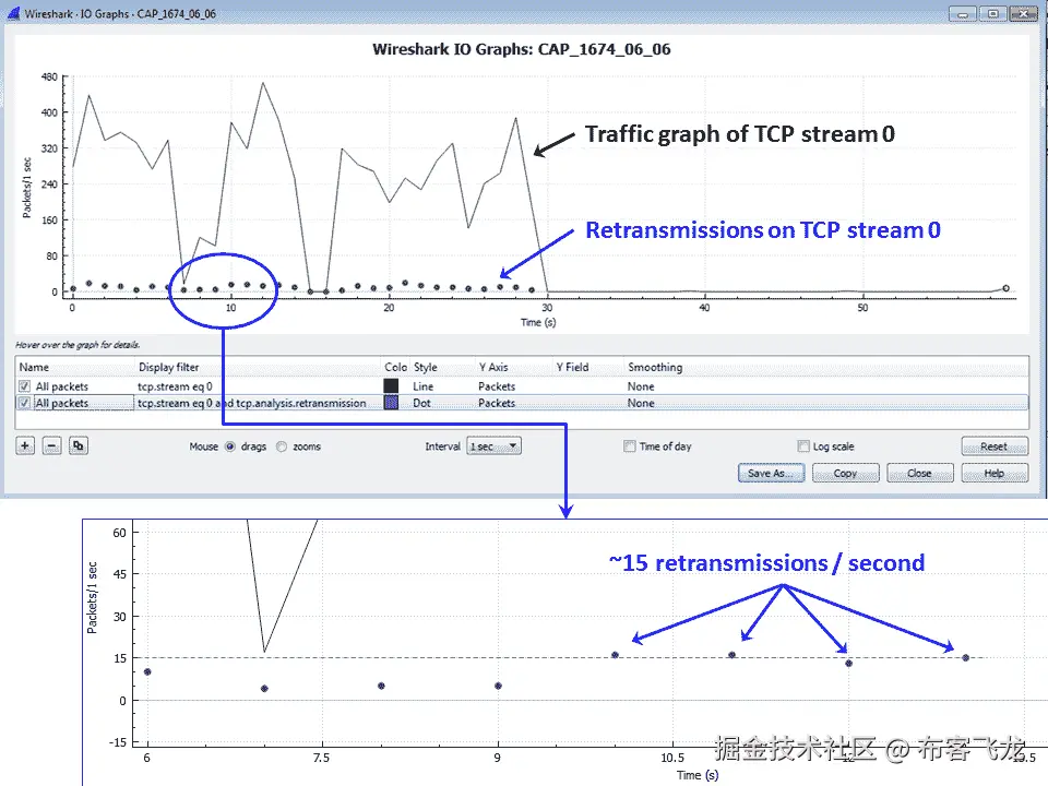 在下面的示例中,CAP_1674_06_02,您会看到一个包含所有数据包、tcp.analysis.duplicate_ack和tcp.analysis.fast_retransmission过滤器的流量图: