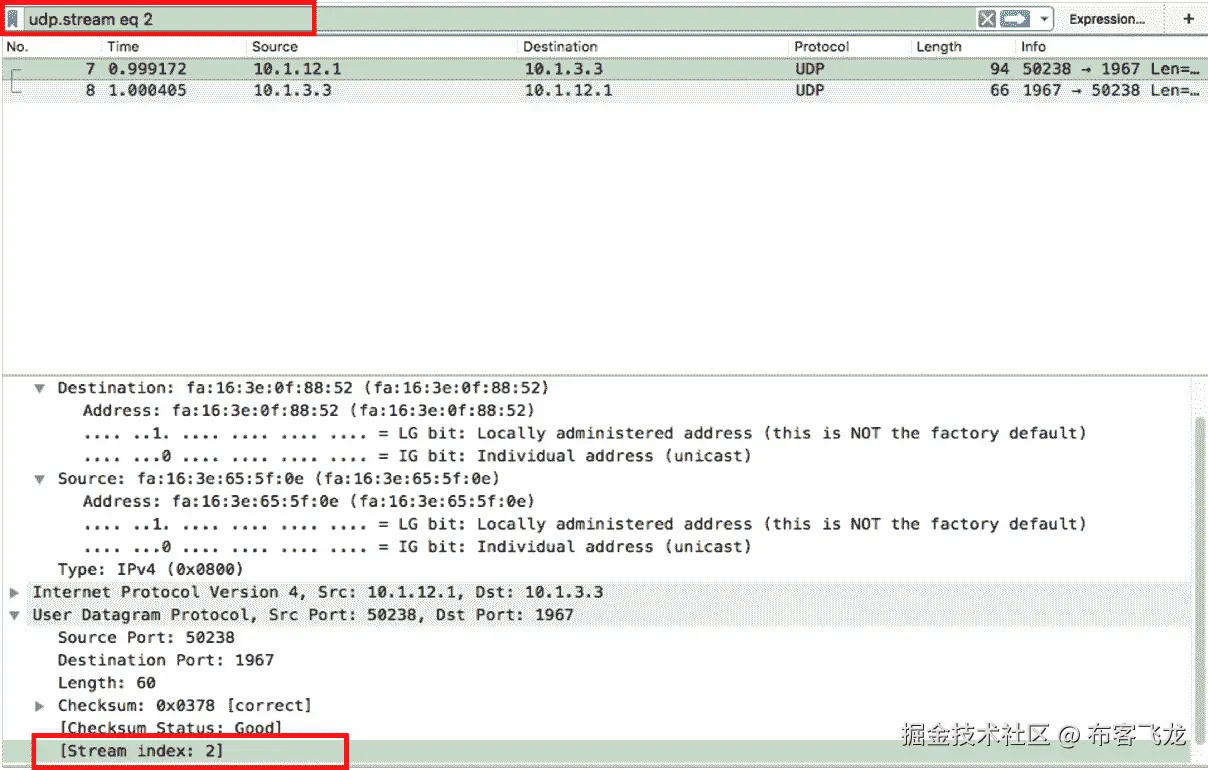 - 在捕获的数据中,单击属于通信流的任何数据包。在 TCP 中,会是特定的连接;在 UDP 中,它只是一个 IP/端口对之间的流。