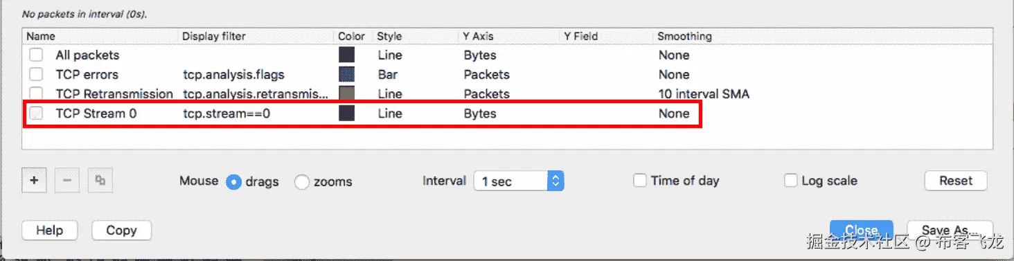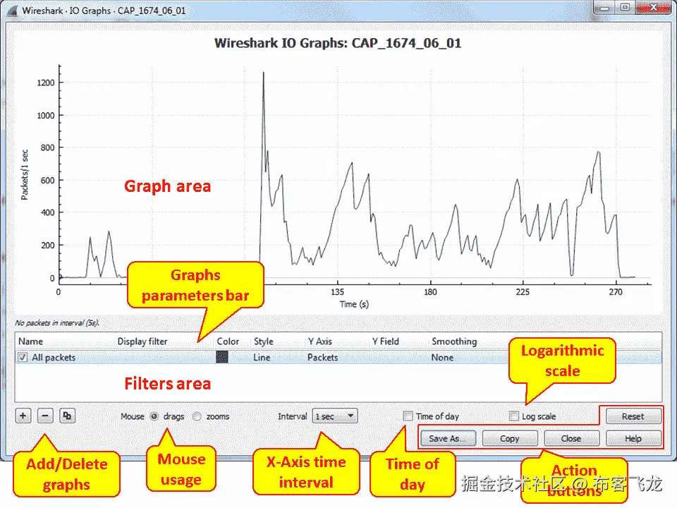 在窗口的上部,您可以看到图形区域。在左下方,您可以看到 filters 区域,该区域允许您配置将启用特定图形的显示过滤器。正如您在前面的截图中看到的,默认值是在 y 轴上的每秒包数和在 x 轴上的以秒为单位的时间。