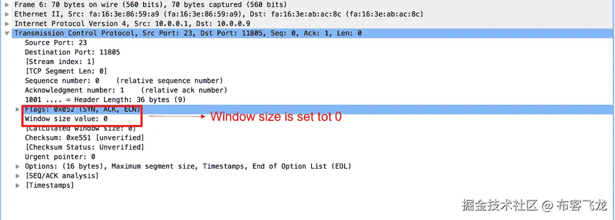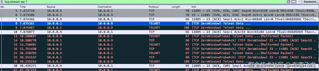前面是 TCP 零窗口的一个例子。接收节点(10.0.0.9)不能接受任何新的会话或数据,因此当它从任何对等方接收到新 TCP 会话的 SYN 段时,它用 SYN,ACK 段进行回复,并将窗口大小设置为 0。通常情况下,一旦接收器准备好接收额外数据,这种情况就会自行纠正。当接收方发送零窗口消息时,看到发送方发送 TCP 零窗口探测是正常的。这是发送方发送的消息,用于查看接收方的零窗口条件是否仍然为真。对于从 TCP 零窗口消息的接收器接收的每个响应,它在发送下一个探测消息之前指数地递增计时器。