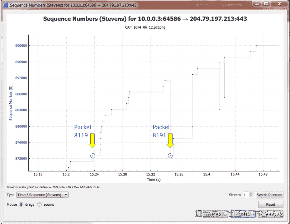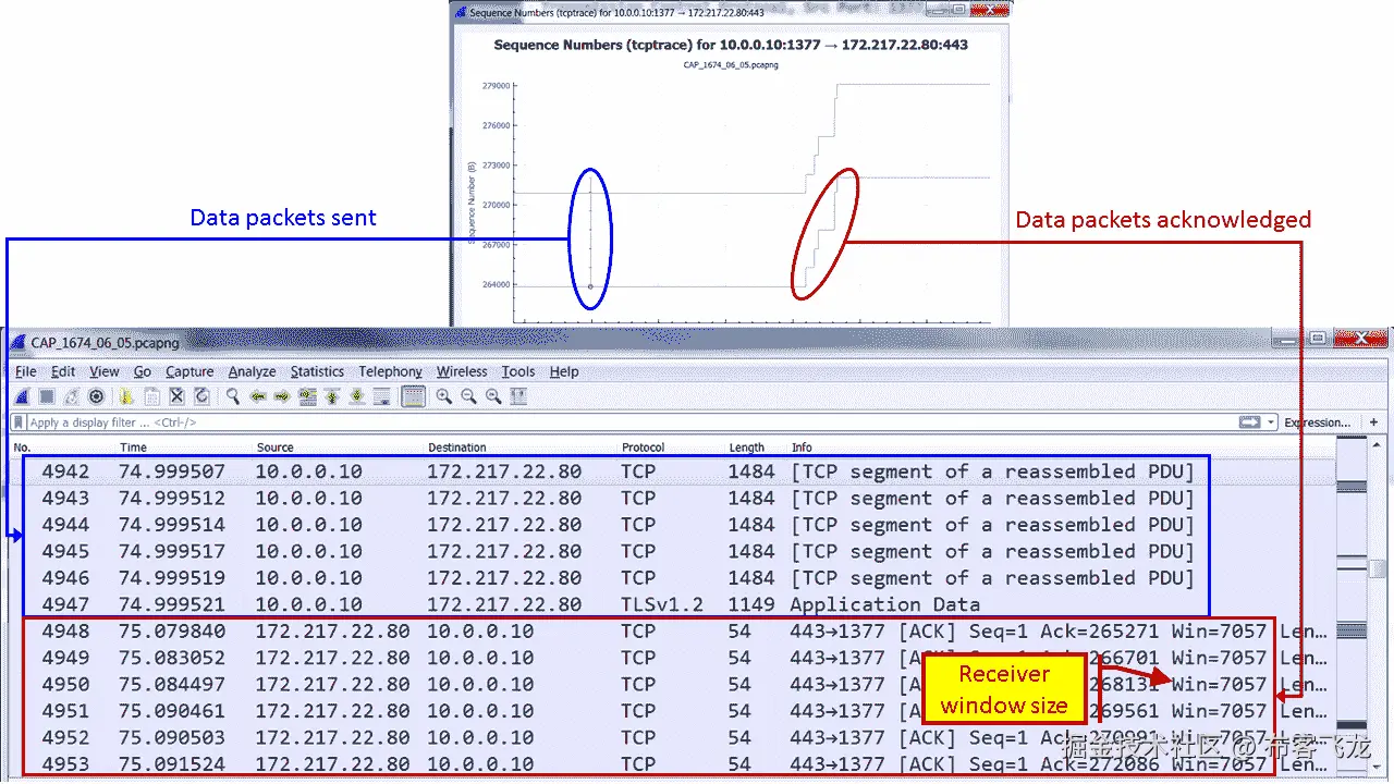 在下一个屏幕截图中,我们看到了一个降低发送方吞吐量的重新传输示例(为清晰起见,添加了红色细线):