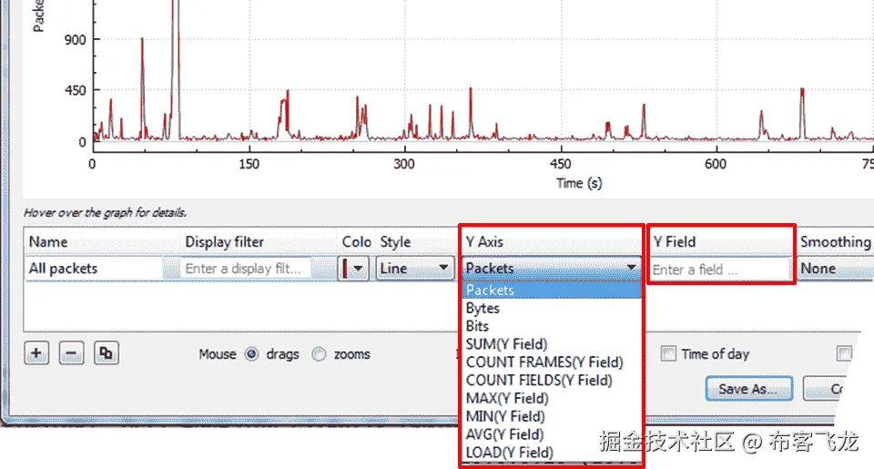 我们可以在 y 轴上测量两种类型的参数。第一种类型是数字参数——数据包、字节和位,相对于 x 轴中的时间刻度进行测量。如下面的屏幕截图所示,第二种类型的参数是 SUM、COUNT FRAMES、COUNT FIELDS、MAX、MIN、AVG 和 LOAD,它们用于 y 轴不一定显示数字的计数,如本章后面的“使用高级 y 轴参数的高级 I/O 图形配置”一节所述:
