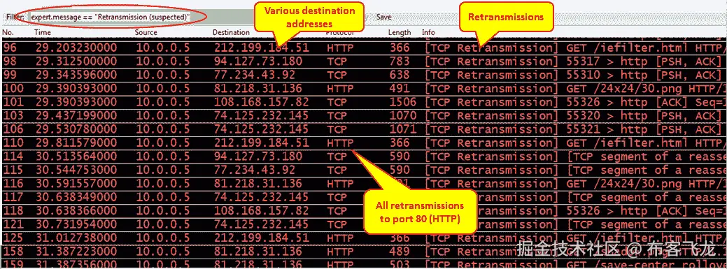 ping命令看到延迟变化。它通常发生在带宽较窄的线路上,有时也发生在蜂窝线路上。 - 负载过重或效率低下的应用。在这种情况下,您将只看到这个特定应用的许多重新传输。