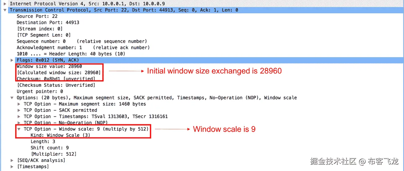 TCP 报头中的窗口大小字段以字节表示,并且该字段是允许携带最大值 65,535 的 16 位字段。对于大多数硬件,可以处理超过 65,535 字节的 TCP 数据段。为了发出大于 65,535 的窗口大小的信号,在初始 TCP 三次握手期间包括 TCP 窗口比例。TCP 对等使用窗口大小值和比例值来导出窗口大小。