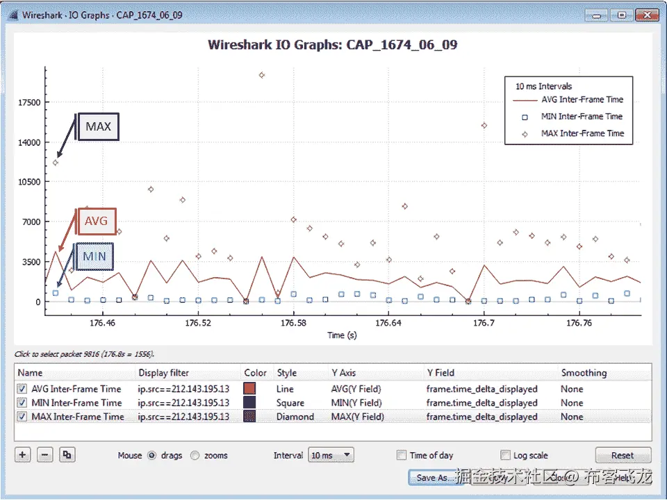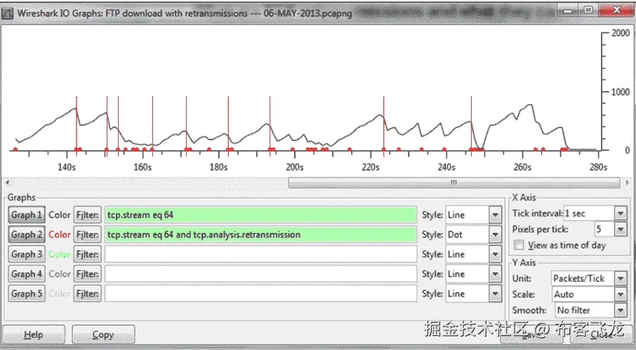 在示例中,您可以看到 x 轴刻度以 10 ms(毫秒)为单位, y 轴刻度以数据包/10 ms 为单位。在第一个图表中,所有数据包是没有任何过滤器的总流量,以线条样式呈现;使用过滤器tcp.analysis. duplicate_ack的第二个图形使用点样式呈现,使用过滤器tcp.analysis. fast_retransmission的第三个图形使用正方形样式呈现。该图以放大的焦点呈现在从捕获开始起 52.5 到 52.86 秒之间的时间上。