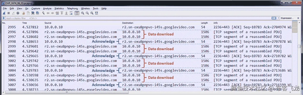 在这里,我们可以看到从googlevideo.com到10.0.0.10的每两个下行分组有一个上行确认,这就是为什么我们看到 1:2 的比率。另一方面,当我们查看数据包长度时,我们可以看到下载流量中的两个数据包的长度为 1,506 字节,而上行确认数据包是一个短的 54 字节长的数据包。